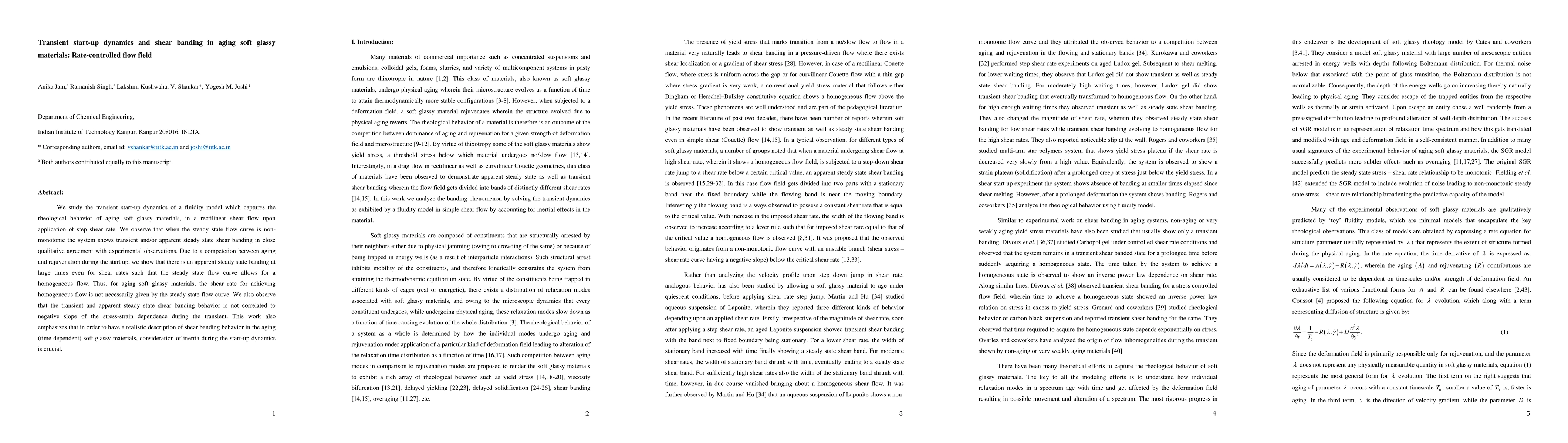 This research investigates the transient start-up dynamics and shear banding in aging soft glassy materials under rectilinear shear flow, finding that apparent shear banding can occur even when the steady-state flow suggests homogeneous flow, highlighting the need for inertial considerations during start-up dynamics.