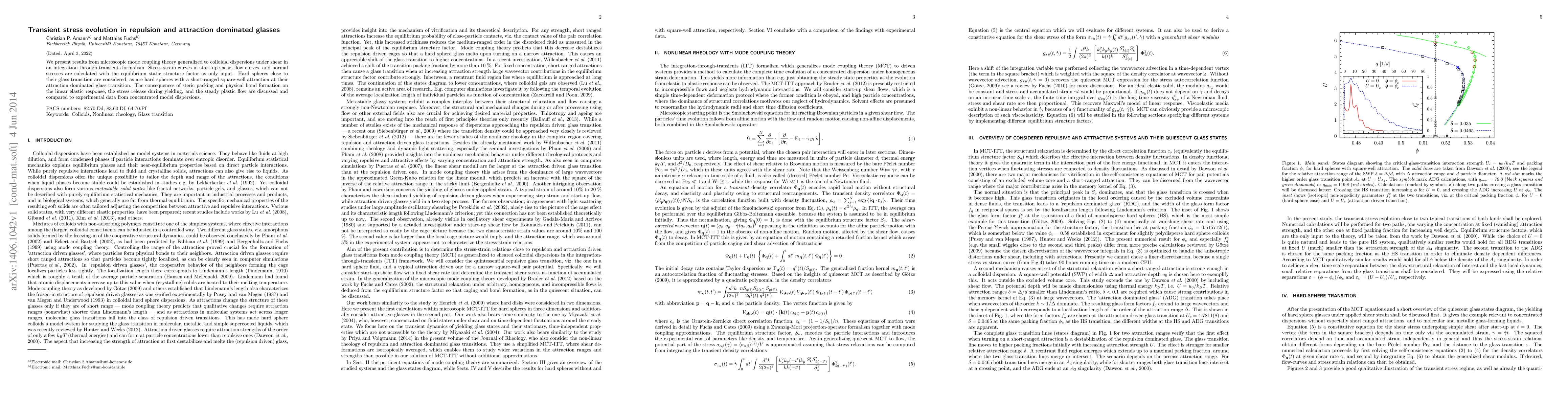 We present results from microscopic mode coupling theory generalized to colloidal dispersions under shear in an integration-through-transients formalism. Stress-strain curves in start-up shear, flow curves, and normal stresses are calculated with the equilibrium static structure factor as only input. Hard spheres close to their glass transition are considered, as are hard spheres with a short-ranged square-well attraction at their attraction dominated glass transition. The consequences of steric packing and physical bond formation on the linear elastic response, the stress release during yielding, and the steady plastic flow are discussed and compared to experimental data from concentrated model dispersions.