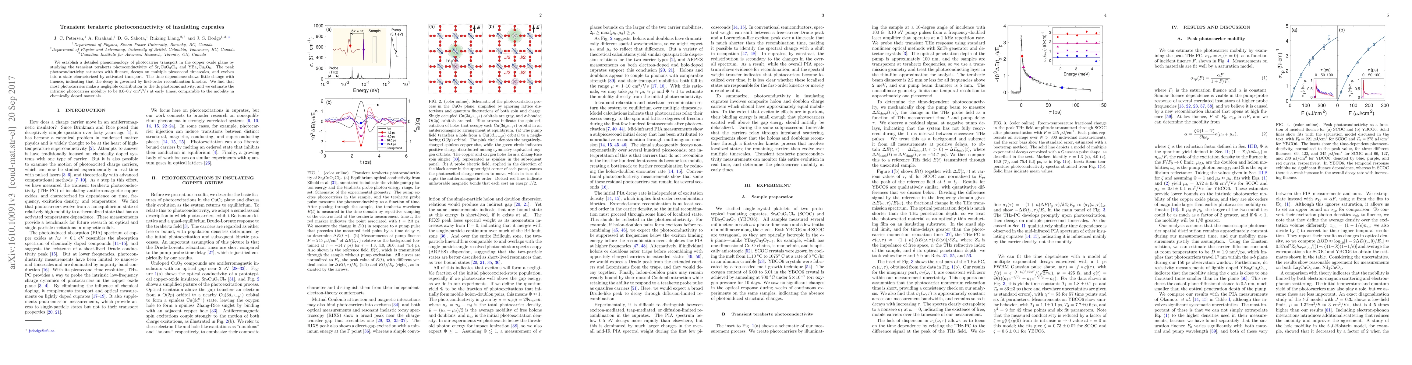 We establish a detailed phenomenology of photocarrier transport in the copper oxide plane by studying the transient terahertz photoconductivity of Sr$_2$CuO$_2$Cl$_2$ and YBa$_2$Cu$_3$O$_6$. The peak photoconductivity saturates with fluence, decays on multiple picosecond timescales, and evolves into a state characterized by activated transport. The time dependence shows little change with fluence, indicating that the decay is governed by first-order recombination kinetics. We find that most photocarriers make a negligible contribution to the dc photoconductivity, and we estimate the intrinsic photocarrier mobility to be 0.6-0.7 cm$^2$/V s at early times, comparable to the mobility in chemically doped materials.