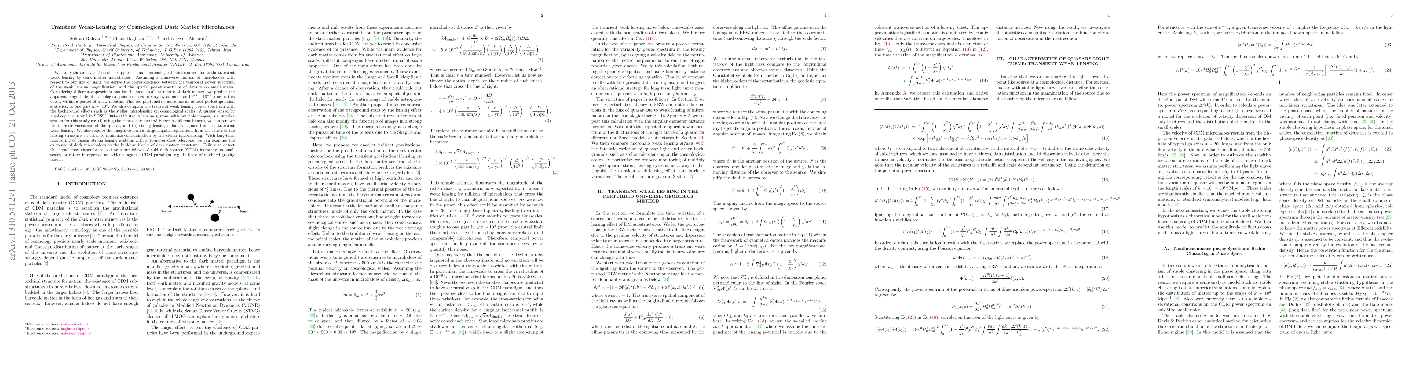 We study the time variation of the apparent flux of cosmological point sources due to the transient weak lensing by dark matter microhaloes. Assuming a transverse motion of microhaloes with respect to our line of sight, we derive the correspondence between the temporal power spectrum of the weak lensing magnification, and the spatial power spectrum of density on small scales. Considering different approximations for the small scale structure of dark matter, we predict the apparent magnitude of cosmological point sources to vary by as much as $10^{-4}-10^{-3}$, due to this effect, within a period of a few months. This red photometric noise has an almost perfect gaussian statistics, to one part in $\sim 10^4$. We also compare the transient weak lensing power spectrum with the background effects such as the stellar microlensing on cosmological scales. A quasar lensed by a galaxy or cluster like SDSSJ1004+4112 strong lensing system, with multiple images, is a suitable system for this study as: (i) using the time-delay method between different images, we can remove the intrinsic variations of the quasar, and (ii) strong lensing enhances signals from the transient weak lensing. We also require the images to form at large angular separations from the center of the lensing structure, in order to minimize contamination by the stellar microlensing. With long-term monitoring of quasar strong lensing systems with a 10-meter class telescope, we can examine the existence of dark microhaloes as the building blocks of dark matter structures. Failure to detect this signal may either be caused by a breakdown of cold dark matter (CDM) hierarchy on small scales, or rather interpreted as evidence against CDM paradigm, e.g. in favor of modified gravity models.