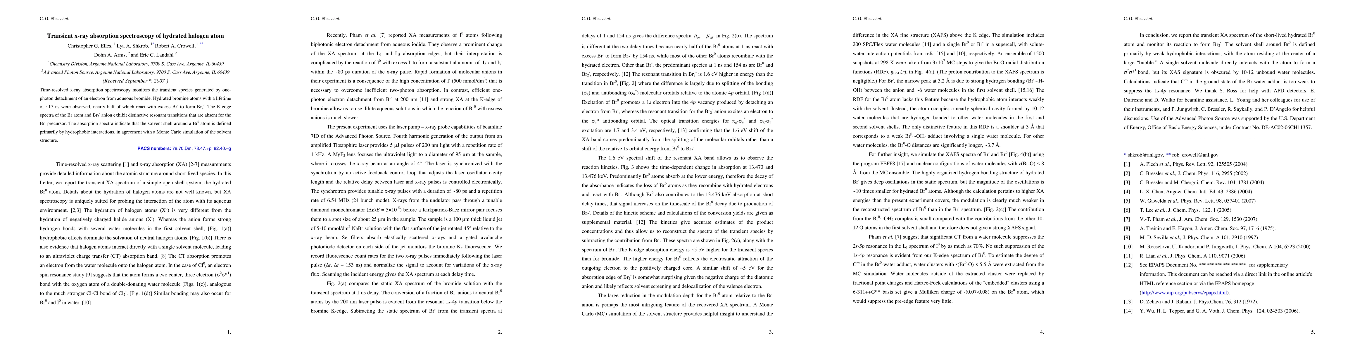Time-resolved x-ray absorption spectroscopy monitors the transient species generated by one-photon detachment of an electron from aqueous bromide. Hydrated bromine atoms with a lifetime of ca. 17 ns were observed, nearly half of which react with excess Br- to form Br2-. The K-edge spectra of the Br atom and Br2- anion exhibit distinctive resonant transitions that are absent for the Br- precursor. The absorption spectra indicate that the solvent shell around a Br0 atom is defined primarily by hydrophobic interactions, in agreement with a Monte Carlo simulation of the solvent structure.