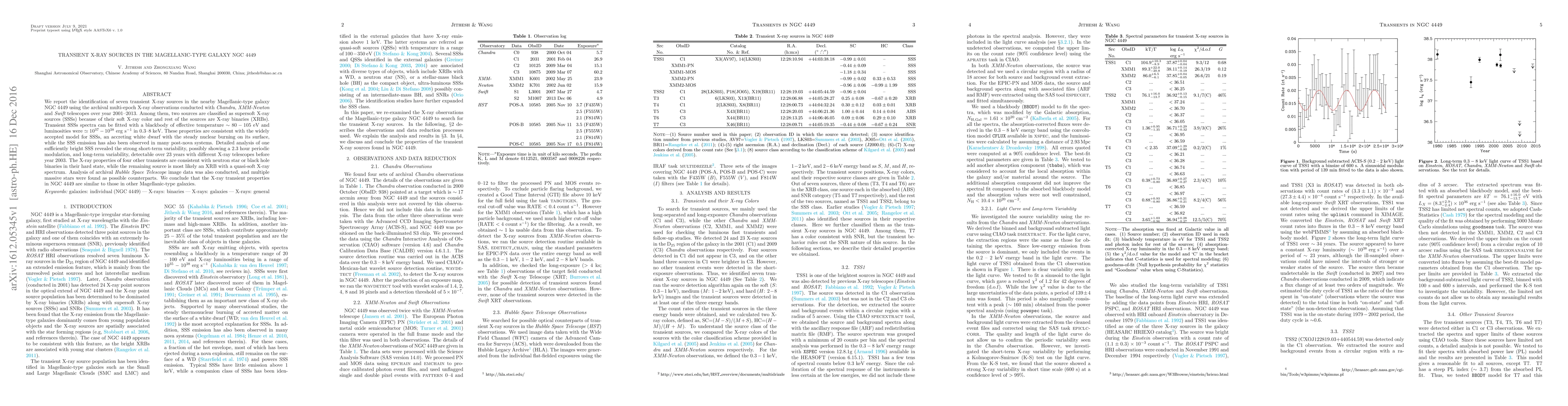Archival Chandra, XMM-Newton, and Swift observations were used to study transient X-ray sources in the Magellanic-type galaxy NGC 4449. The study identified seven transient sources, classifying two as supersoft X-ray sources (SSSs) and four as X-ray binaries (XRBs).