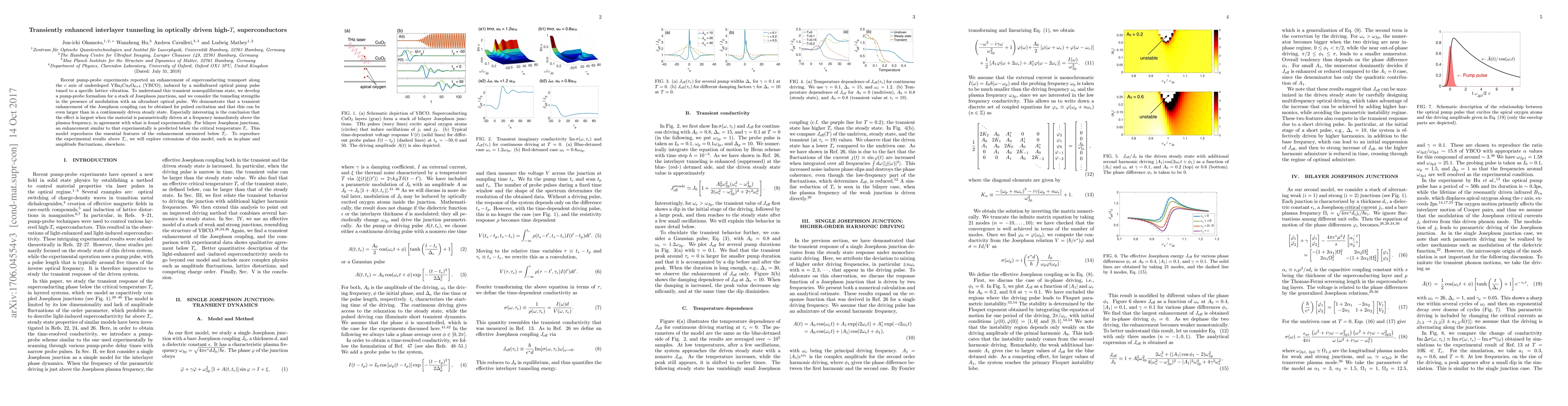 Recent pump-probe experiments reported an enhancement of superconducting transport along the $c$-axis of underdoped YBa$_2$Cu$_3$O$_{6+\delta}$ (YBCO), induced by a mid-infrared optical pump pulse tuned to a specific lattice vibration. To understand this transient non-equilibrium state, we develop a pump-probe formalism for a stack of Josephson junctions, and we consider the tunneling strengths in presence of modulation with an ultrashort optical pulse. We demonstrate that a transient enhancement of the Josephson coupling can be obtained for pulsed excitation and that this can be even larger than in a continuously driven steady-state. Especially interesting is the conclusion that the effect is largest when the material is parametrically driven at a frequency immediately above the plasma frequency, in agreement with what is found experimentally. For bilayer Josephson junctions, an enhancement similar to that experimentally is predicted below the critical temperature $T_c$. This model reproduces the essential features of the enhancement measured below $T_c$. To reproduce the experimental results above $T_c$, we will explore extensions of this model, such as in-plane and amplitude fluctuations, elsewhere.