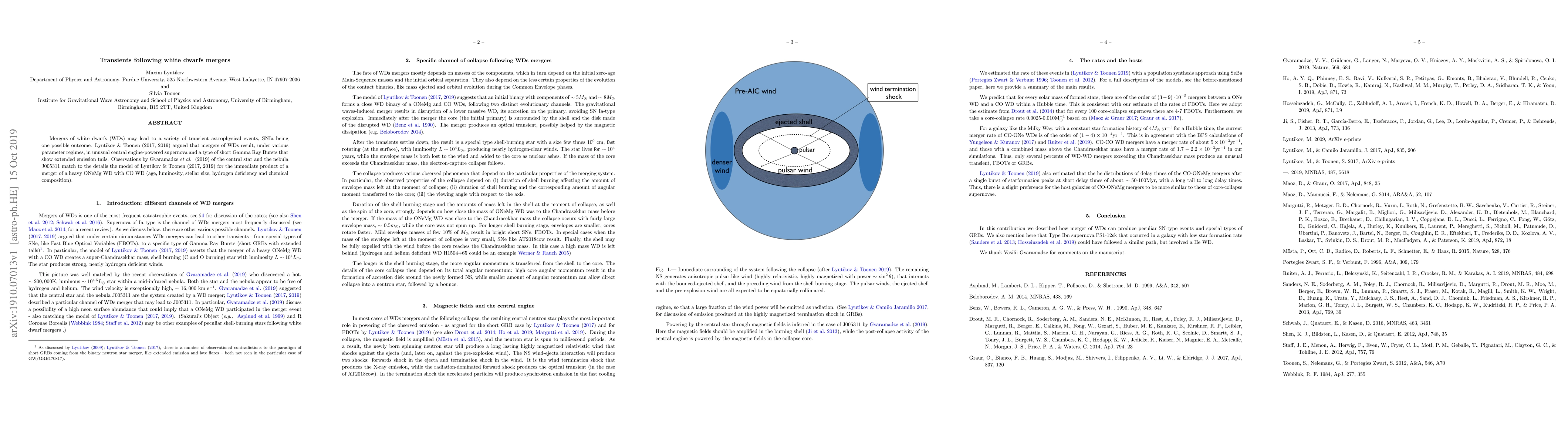 Mergers of white dwarfs (WDs) may lead to a variety of transient astrophysical events, SNIa being one possible outcome. Lyutikov & Toonen (2017, 2019) argued that mergers of WDs result, under various parameter regimes, in unusual central engine-powered supernova and a type of short Gamma Ray Bursts that show extended emission tails. Observations by Gvaramadze et al. (2019) of the central star and the nebula J005311 match to the details the model of Lyutikov & Toonen (2017, 2019) for the immediate product of a merger of a heavy ONeMg WD with CO WD (age, luminosity, stellar size, hydrogen deficiency and chemical composition).