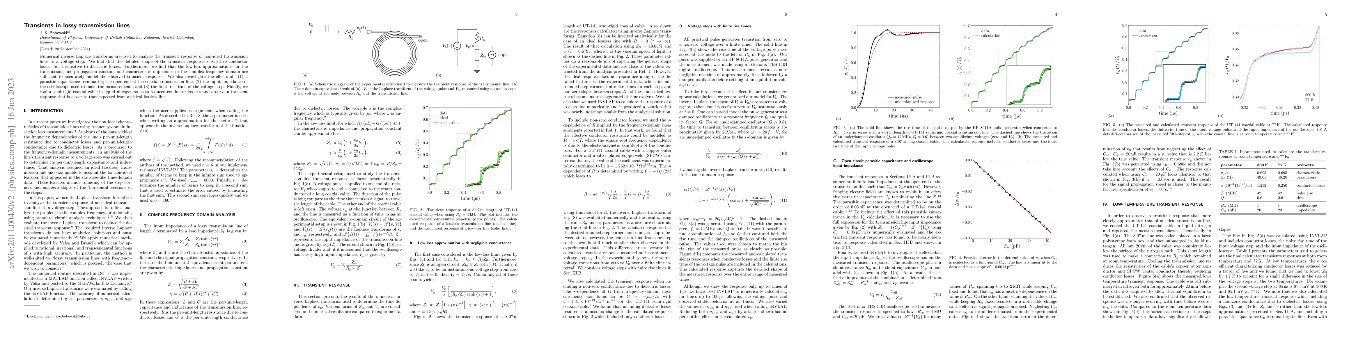 This study uses numerical inverse Laplace transforms to analyze transient responses in lossy transmission lines to voltage steps, revealing sensitivity to conductor losses but not dielectric losses. The low-loss approximations are sufficient for accurate modeling, and additional factors like parasitic capacitance, oscilloscope input impedance, and voltage step rise time are also examined. Cooling the conductor in liquid nitrogen reduces losses and aligns the transient response more closely with an ideal lossless line.