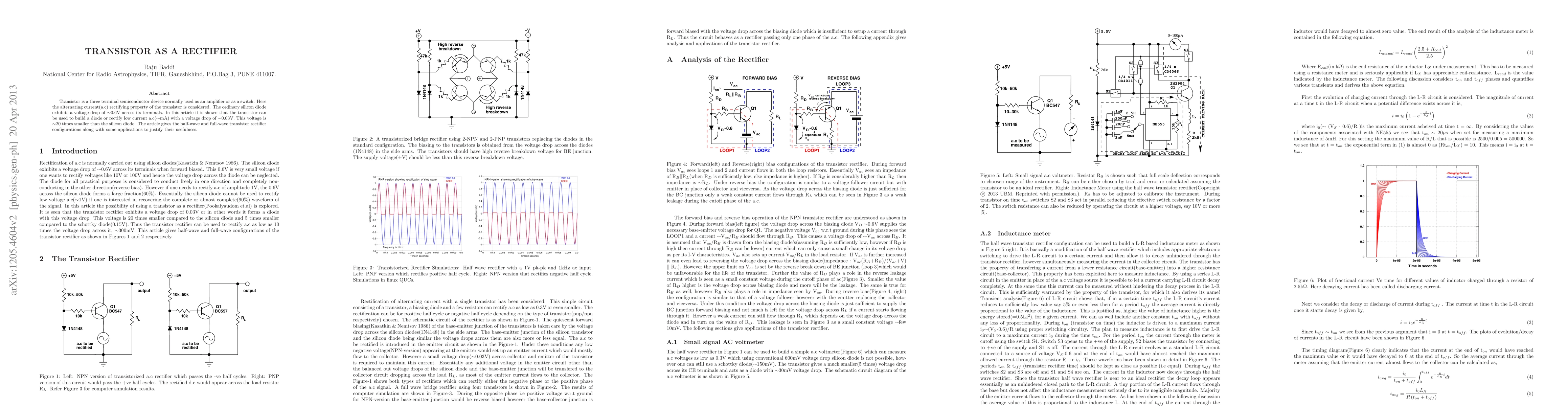 This paper explores the transistor's ability to rectify low current AC with minimal voltage drop (~0.03V), significantly less than a typical silicon diode (~0.6V). It presents configurations for both half-wave and full-wave transistor rectifiers and discusses their practical applications.