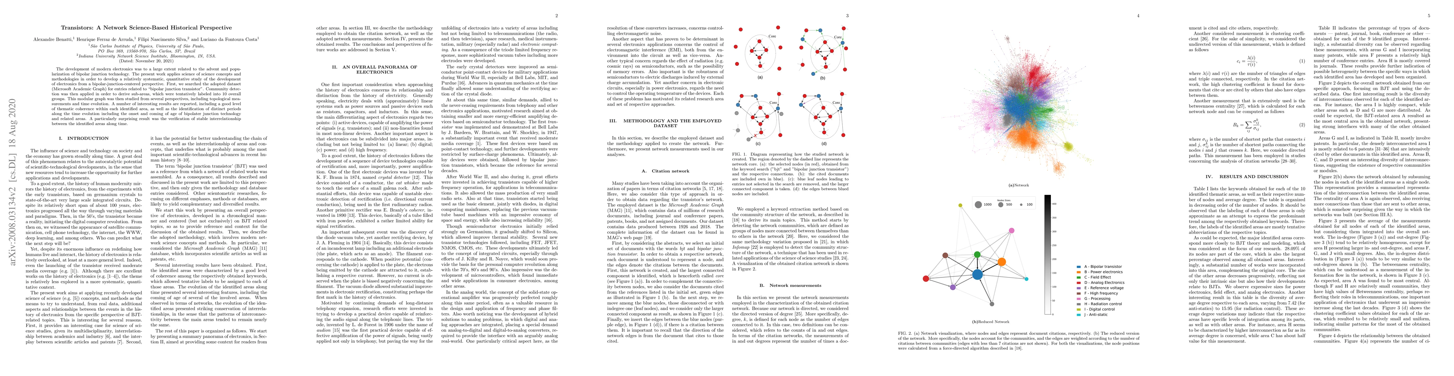 A study applied network science concepts to analyze the development of electronics from a bipolar junction transistor perspective, revealing thematic coherence within identified areas and stable interrelationships over time.