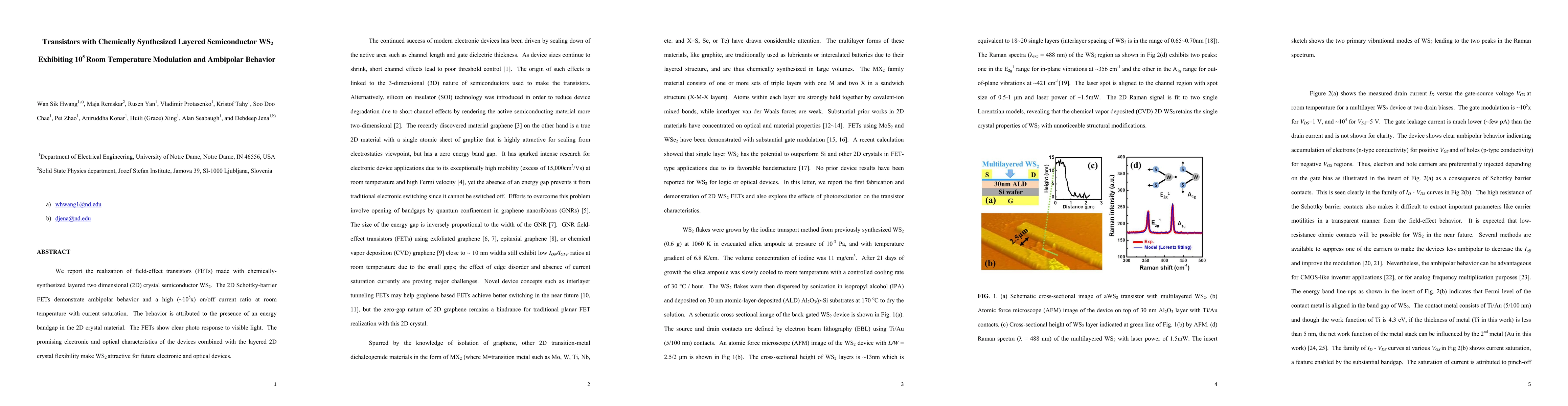 This paper reports the development of field-effect transistors using chemically synthesized WS2, a layered 2D semiconductor, which exhibits high (~105x) on/off current ratio and ambipolar behavior at room temperature. The devices show promising electronic and optical properties due to the material's energy bandgap and flexibility.