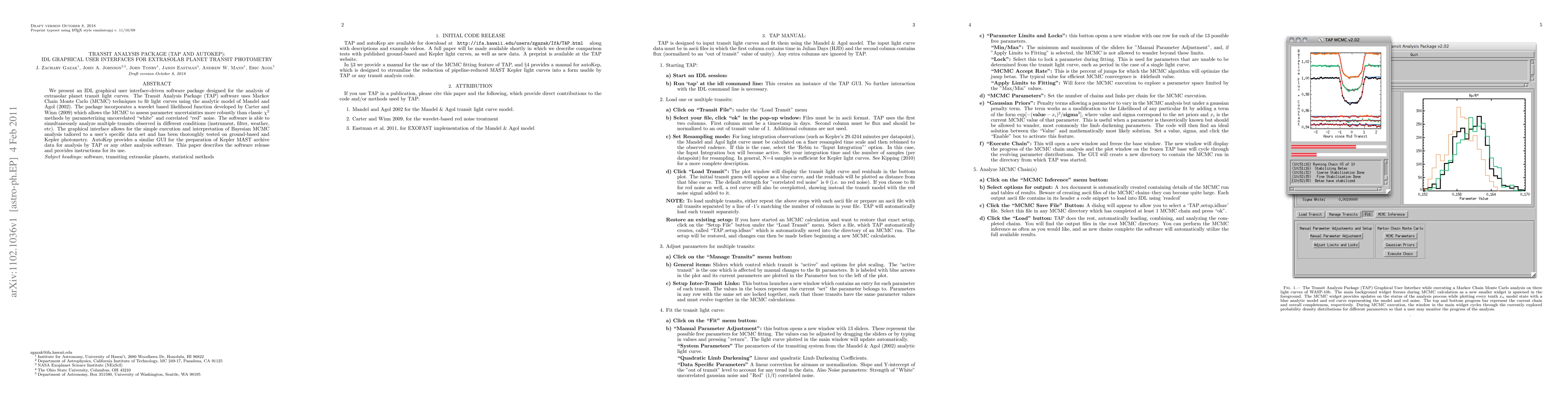 We present an IDL graphical user interface-driven software package designed for the analysis of extrasolar planet transit light curves. The Transit Analysis Package (TAP) software uses Markov Chain Monte Carlo (MCMC) techniques to fit light curves using the analytic model of Mandel and Agol (2002). The package incorporates a wavelet based likelihood function developed by Carter and Winn (2009) which allows the MCMC to assess parameter uncertainties more robustly than classic chi-squared methods by parameterizing uncorrelated "white" and correlated "red" noise. The software is able to simultaneously analyze multiple transits observed in different conditions (instrument, filter, weather, etc). The graphical interface allows for the simple execution and interpretation of Bayesian MCMC analysis tailored to a user's specific data set and has been thoroughly tested on ground-based and Kepler photometry. AutoKep provides a similar GUI for the preparation of Kepler MAST archive data for analysis by TAP or any other analysis software. This paper describes the software release and provides instructions for its use.