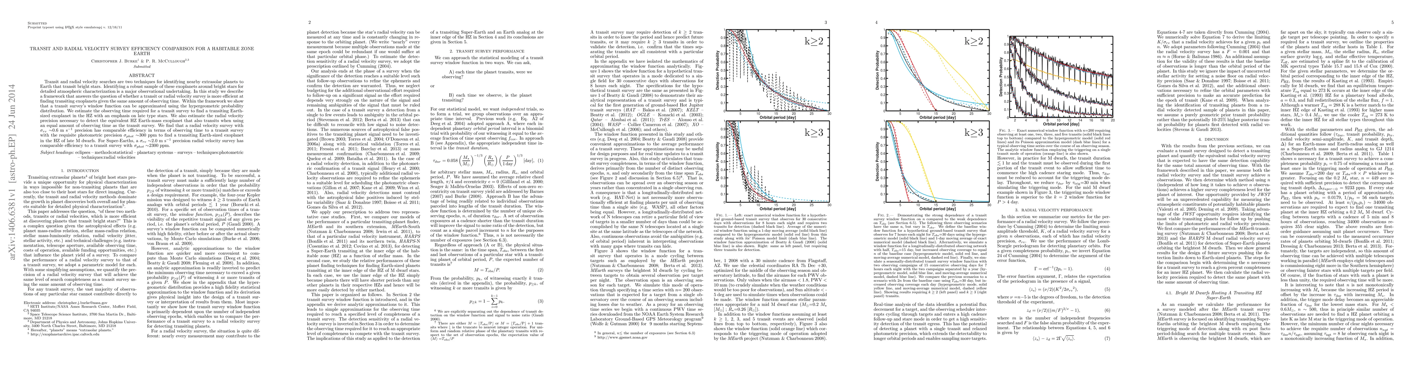This paper compares the efficiency of transit and radial velocity surveys for detecting Earth-sized exoplanets in the habitable zone, finding that a radial velocity survey with 0.6 m/s precision is as efficient as a transit survey requiring 300 ppm photometric precision. For Super-Earths, a 2.0 m/s precision radial velocity survey matches the efficiency of a transit survey needing 2300 ppm precision.