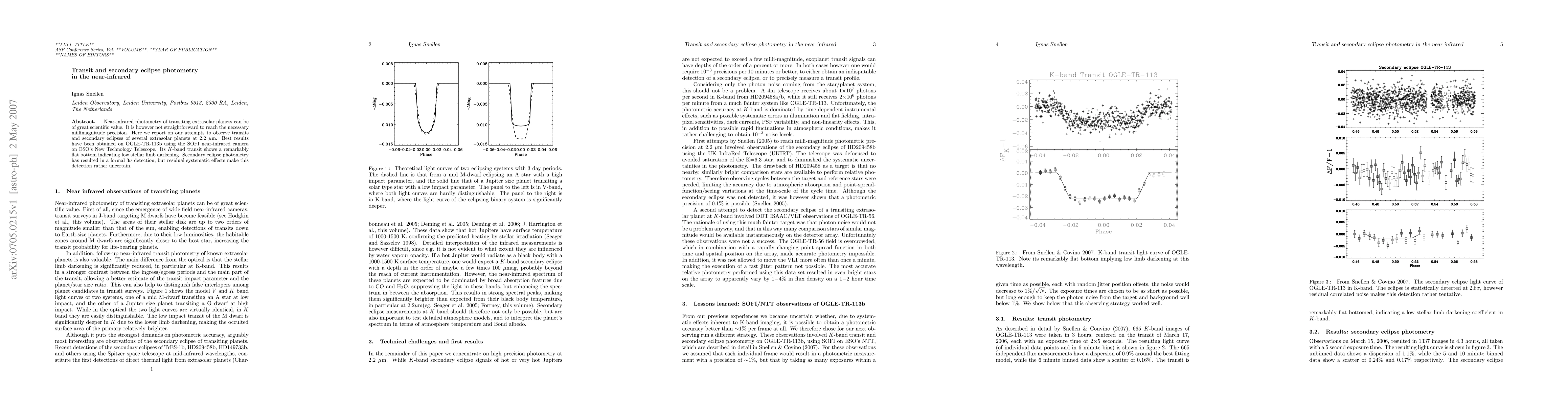 This paper reports on near-infrared photometry efforts to achieve millimagnitude precision for transiting extrasolar planets, focusing on OGLE-TR-113b. The study achieved a flat K-band transit profile, indicating low stellar limb darkening, but secondary eclipse detection remains uncertain due to residual systematic effects.