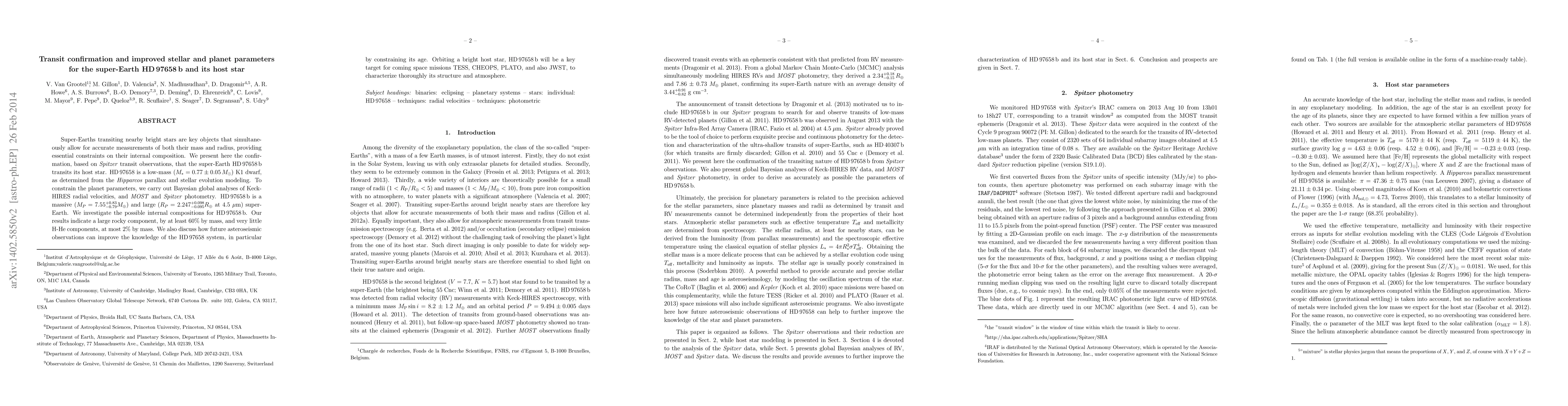 This research confirms the super-Earth HD 97658 b orbits its host star, a low-mass K1 dwarf, through Spitzer transit observations. Using Keck-HIRES radial velocities, MOST, and Spitzer photometry, the study reveals HD 97658 b's mass (7.55±0.83 M_⊕) and radius (2.247±0.095 R_⊕). The planet is primarily rocky, with minimal hydrogen and helium components. Future missions like TESS, CHEOPS, PLATO, and JWST will further analyze HD 97658 b's structure and atmosphere.