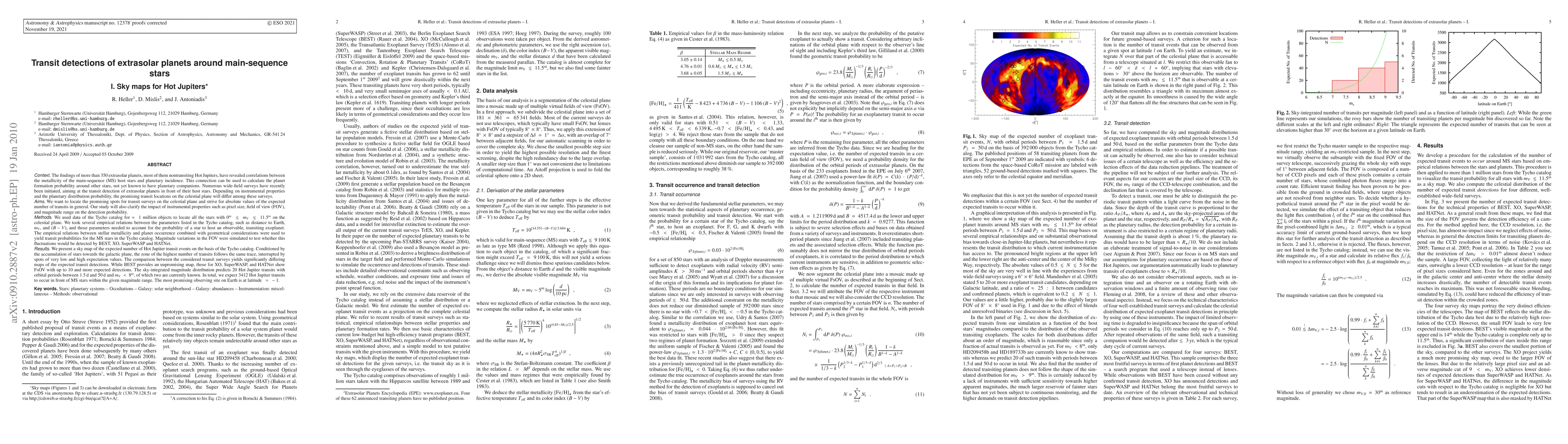 The findings of more than 350 extrasolar planets, most of them nontransiting Hot Jupiters, have revealed correlations between the metallicity of the main-sequence (MS) host stars and planetary incidence. This connection can be used to calculate the planet formation probability around other stars, not yet known to have planetary companions. We locate the promising spots for current transit surveys on the celestial plane and strive for absolute values of the expected number of transits in general. We used data of the Tycho catalog for about 1 million objects to locate all the stars with 0m < m_V < 11.5m on the celestial plane. We took several empirical relations between the parameters listed in the Tycho catalog, such as distance to Earth, m_V, and (B-V), and those parameters needed to account for the probability of a star to host an observable, transiting exoplanet. The empirical relations between stellar metallicity and planet occurrence combined with geometrical considerations were used to yield transit probabilities for the MS stars in the Tycho catalog. Magnitude variations in the FOV were simulated to test whether this fluctuations would be detected by BEST, XO, SuperWASP and HATNet. We present a sky map of the expected number of Hot Jupiter transit events on the basis of the Tycho catalog. The comparison between the considered transit surveys yields significantly differing maps of the expected transit detections. The sky-integrated magnitude distribution predicts 20 Hot Jupiter transits with orbital periods between 1.5 d and 50 d and m_V < 8m, of which two are currently known. In total, we expect 3412 Hot Jupiter transits to occur in front of MS stars within the given magnitude range. The most promising observing site on Earth is at latitude = -1.