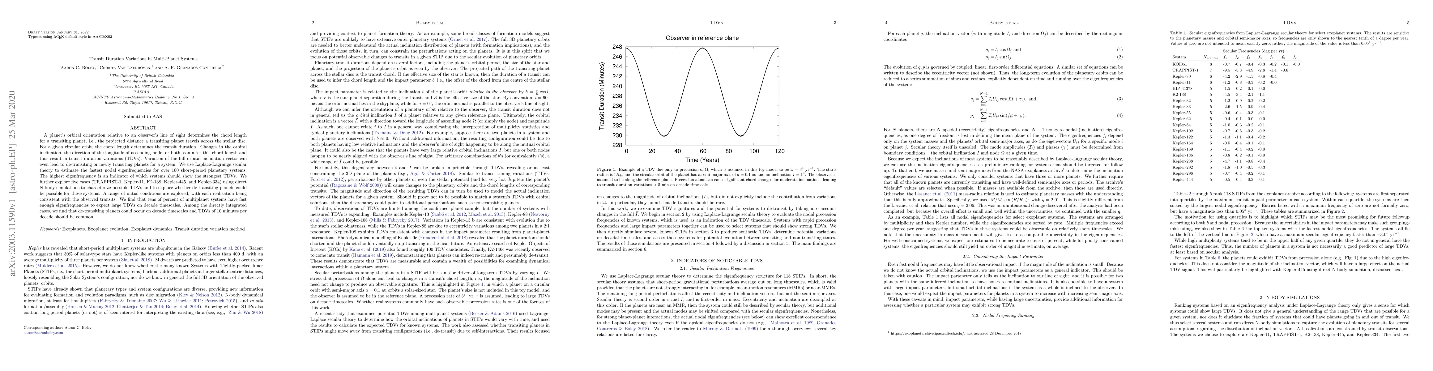 A planet's orbital orientation relative to an observer's line of sight determines the chord length for a transiting planet, i.e., the projected distance a transiting planet travels across the stellar disc. For a given circular orbit, the chord length determines the transit duration. Changes in the orbital inclination, the direction of the ascending node, or both, can alter this chord length and thus result in transit duration variations (TDVs). Variation of the full orbital inclination vector can even lead to de-transiting or newly transiting planets for a system. We use Laplace-Lagrange secular theory to estimate the fastest nodal eigenfrequencies for over 100 short-period planetary systems. The highest eigenfrequency is an indicator of which systems should show the strongest TDVs. We further explore five cases (TRAPPIST-1, Kepler-11, K2-138, Kepler-445, and Kepler-334) using direct N-body simulations to characterize possible TDVs and to explore whether de-transiting planets could be possible for these systems. A range of initial conditions are explored, with each realization being consistent with the observed transits. We find that tens of percent of multiplanet systems have fast enough eigenfrequencies to expect large TDVs on decade timescales. Among the directly integrated cases, we find that de-transiting planets could occur on decade timescales and TDVs of 10 minutes per decade should be common.
