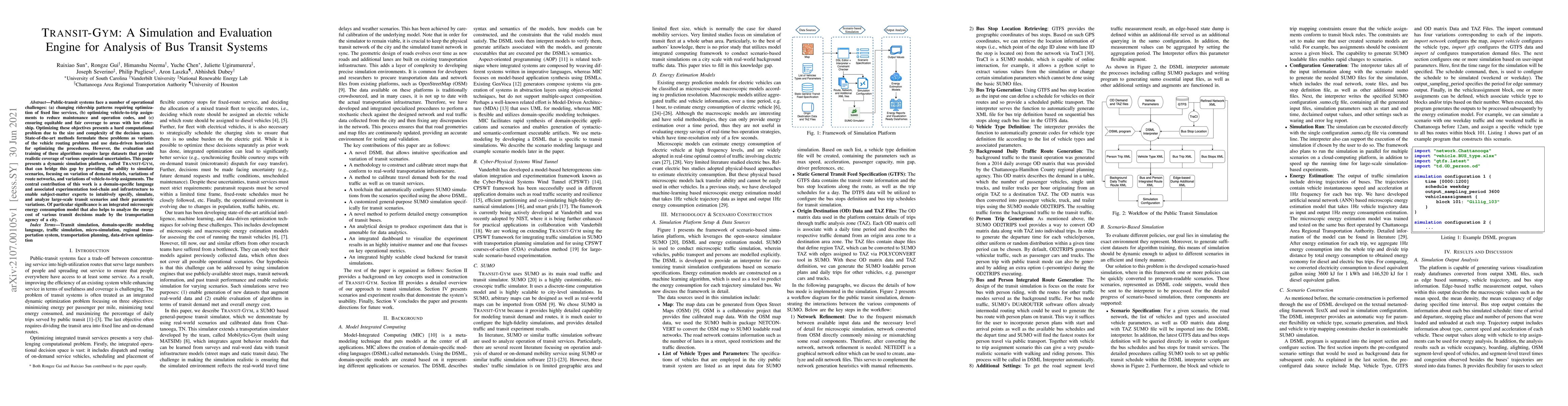 Public-transit systems face a number of operational challenges: (a) changing ridership patterns requiring optimization of fixed line services, (b) optimizing vehicle-to-trip assignments to reduce maintenance and operation codes, and (c) ensuring equitable and fair coverage to areas with low ridership. Optimizing these objectives presents a hard computational problem due to the size and complexity of the decision space. State-of-the-art methods formulate these problems as variants of the vehicle routing problem and use data-driven heuristics for optimizing the procedures. However, the evaluation and training of these algorithms require large datasets that provide realistic coverage of various operational uncertainties. This paper presents a dynamic simulation platform, called Transit-Gym, that can bridge this gap by providing the ability to simulate scenarios, focusing on variation of demand models, variations of route networks, and variations of vehicle-to-trip assignments. The central contribution of this work is a domain-specific language and associated experimentation tool-chain and infrastructure to enable subject-matter experts to intuitively specify, simulate, and analyze large-scale transit scenarios and their parametric variations. Of particular significance is an integrated microscopic energy consumption model that also helps to analyze the energy cost of various transit decisions made by the transportation agency of a city.