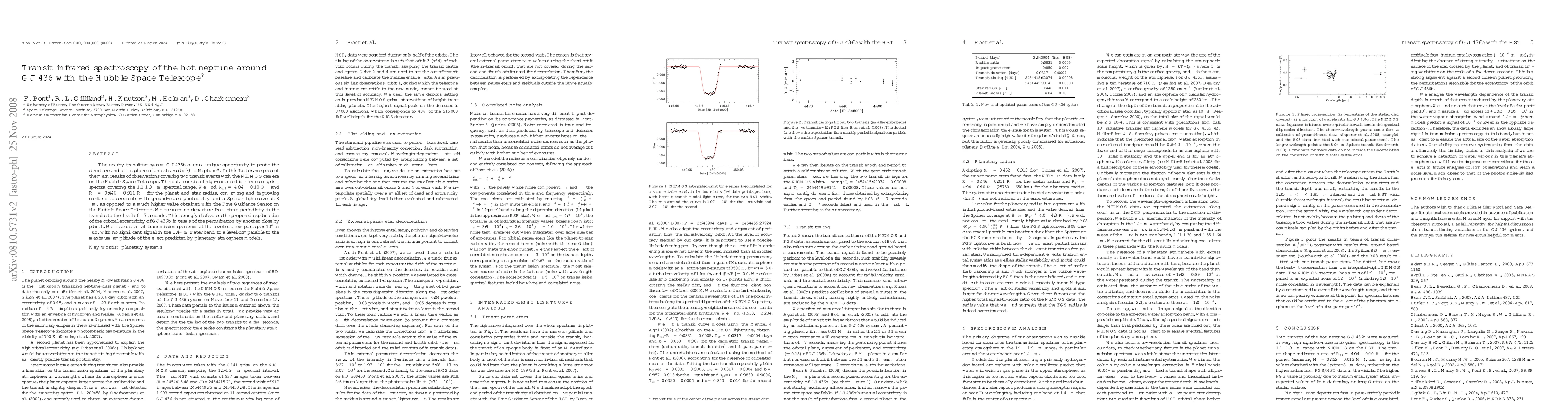 This study uses Hubble Space Telescope observations to analyze the transiting hot Neptune GJ 436b, finding a planet radius of 4.04 ± 0.10 R_earth and confirming the star's radius. The flat transmission spectrum suggests no significant water vapor presence, and no evidence of orbital eccentricity perturbations.