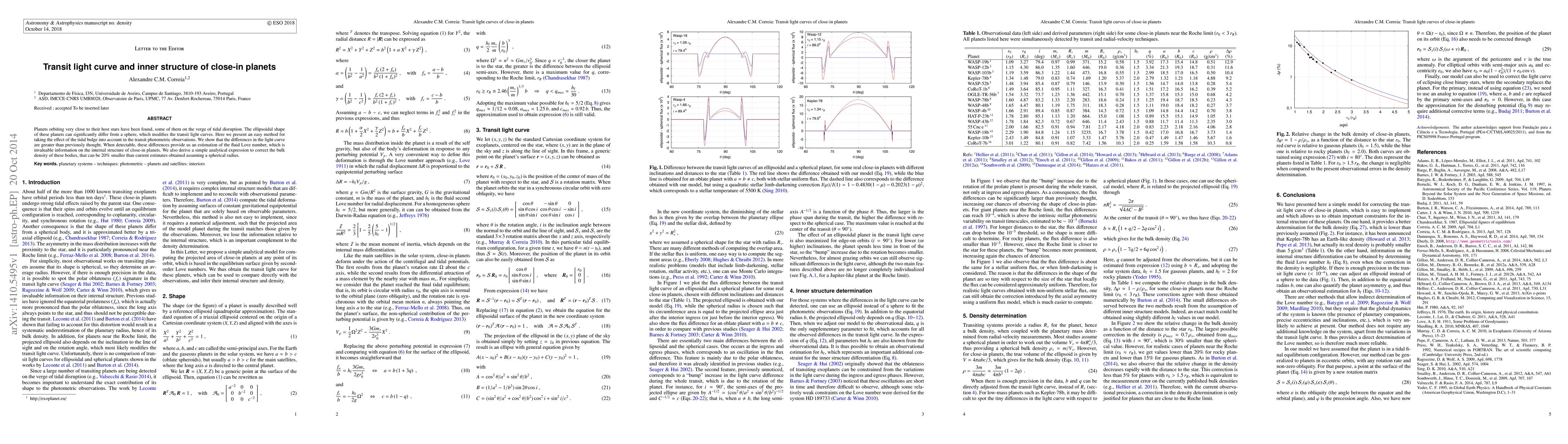 Planets orbiting very close to their host stars have been found, some of them on the verge of tidal disruption. The ellipsoidal shape of these planets can significantly differ from a sphere, which modifies the transit light curves. Here we present an easy method for taking the effect of the tidal bulge into account in the transit photometric observations. We show that the differences in the light curve are greater than previously thought. When detectable, these differences provide us an estimation of the fluid Love number, which is invaluable information on the internal structure of close-in planets. We also derive a simple analytical expression to correct the bulk density of these bodies, that can be 20% smaller than current estimates obtained assuming a spherical radius.