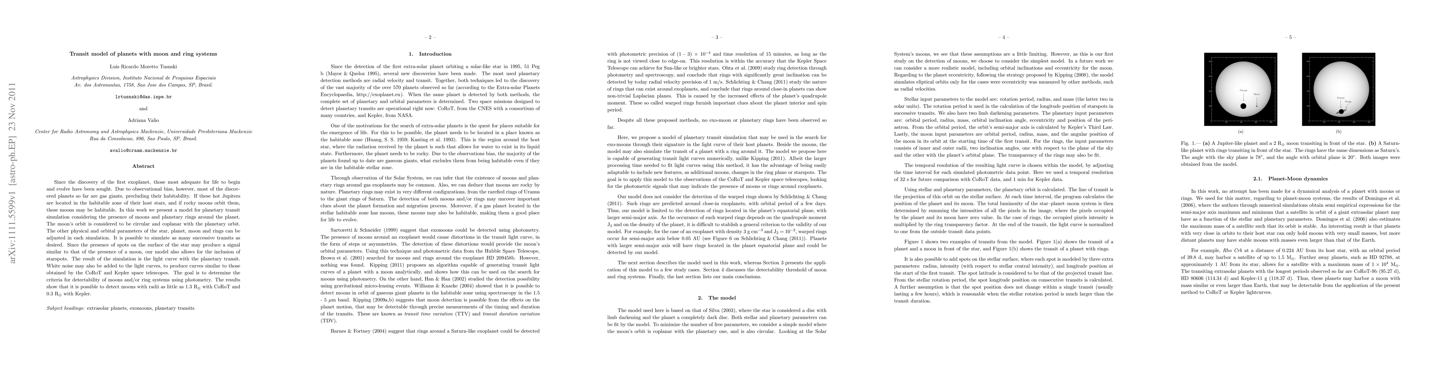 Since the discovery of the first exoplanets, those most adequate for life to begin and evolve have been sought. Due to observational bias, however, most of the discovered planets so far are gas giants, precluding their habitability. However, if these hot Jupiters are located in the habitable zones of their host stars, and if rocky moons orbit them, then these moons may be habitable. In this work, we present a model for planetary transit simulation considering the presence of moons and planetary rings around a planet. The moon's orbit is considered to be circular and coplanar with the planetary orbit. The other physical and orbital parameters of the star, planet, moon, and rings can be adjusted in each simulation. It is possible to simulate as many successive transits as desired. Since the presence of spots on the surface of the star may produce a signal similar to that of the presence of a moon, our model also allows for the inclusion of starspots. The result of the simulation is a light curve with a planetary transit. White noise may also be added to the light curves to produce curves similar to those obtained by the CoRoT and Kepler space telescopes. The goal is to determine the criteria for detectability of moons and/or ring systems using photometry. The results show that it is possible to detect moons with radii as little as 1.3 R$_{\oplus}$ with CoRoT and 0.3 R_{\oplus}$ with Kepler.