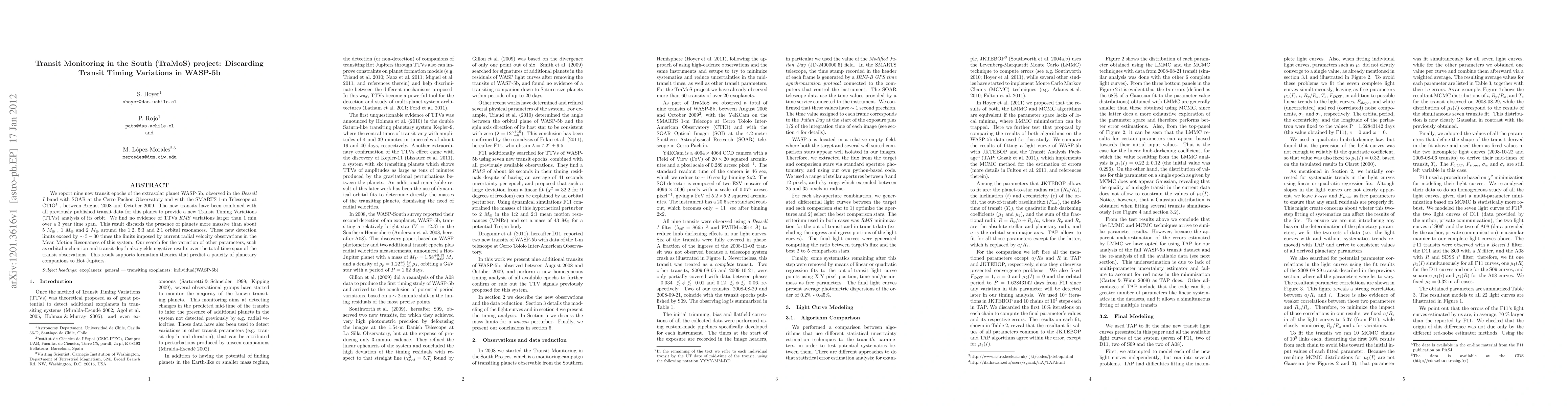 We report nine new transit epochs of the extrasolar planet, observed in the Bessell-I band with SOAR at the Cerro Pachon Observatory and with the SMARTS 1-m Telescope at CTIO, between August 2008 and October 2009. The new transits have been combined with all previously published transit data for this planet to provide a new Transit Timing Variations (TTVs) analysis of its orbit. We find no evidence of TTVs RMS variations larger than 1 min over a 3 year time span. This result discards the presence of planets more massive than about 5 M_earth, 1 M_earth and 2 M_earth around the 1:2, 5:3 and 2:1 orbital resonances. These new detection limits exceed by ~5-30 times the limits imposed by current radial velocity observations in the Mean Motion Resonances of this system. Our search for the variation of other parameters, such as orbital inclination and transit depth also yields negative results over the total time span of the transit observations. This result supports formation theories that predict a paucity of planetary companions to Hot Jupiters.