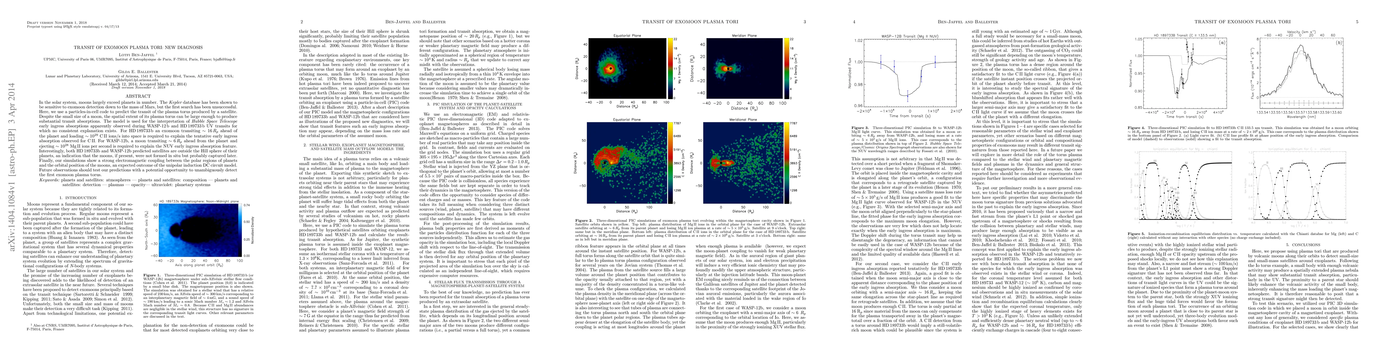 This paper explores the potential transit of exomoon plasma tori using a particles-in-cell code, suggesting that substantial transit absorptions can occur despite the moons' small size. It proposes exomoons for HD 189733b and WASP-12b to explain observed early ingress absorptions, indicating these moons likely formed outside their planets' Hill spheres and exhibit strong electromagnetic coupling with their planets.