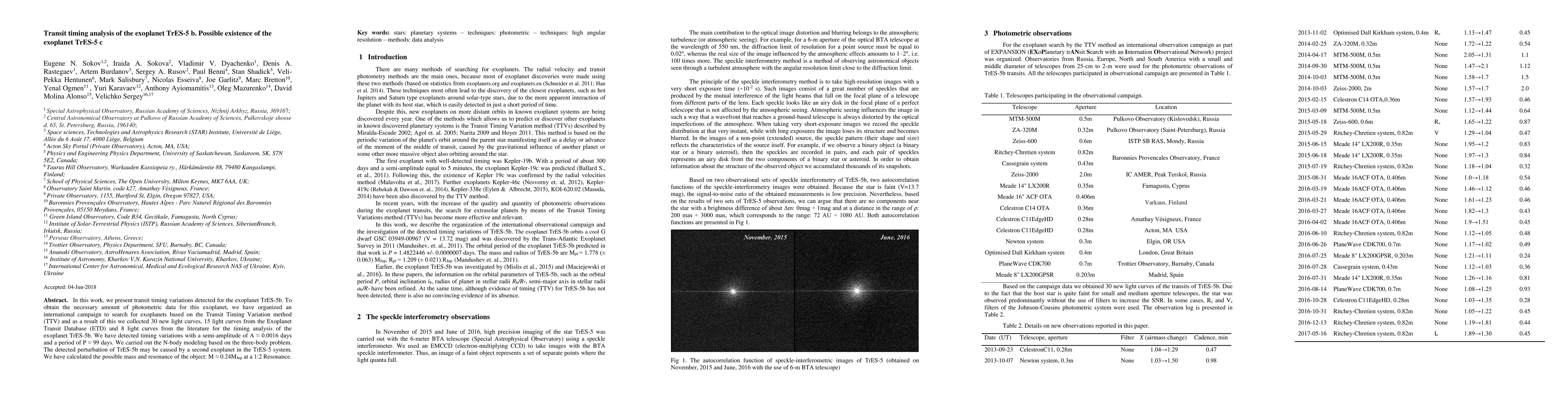 This paper reports transit timing variations in the exoplanet TrES-5b, suggesting the possible existence of a second exoplanet, TrES-5c, with a mass of approximately 0.24 Jupiter masses in a 1:2 resonance, based on N-body modeling of the detected perturbations.