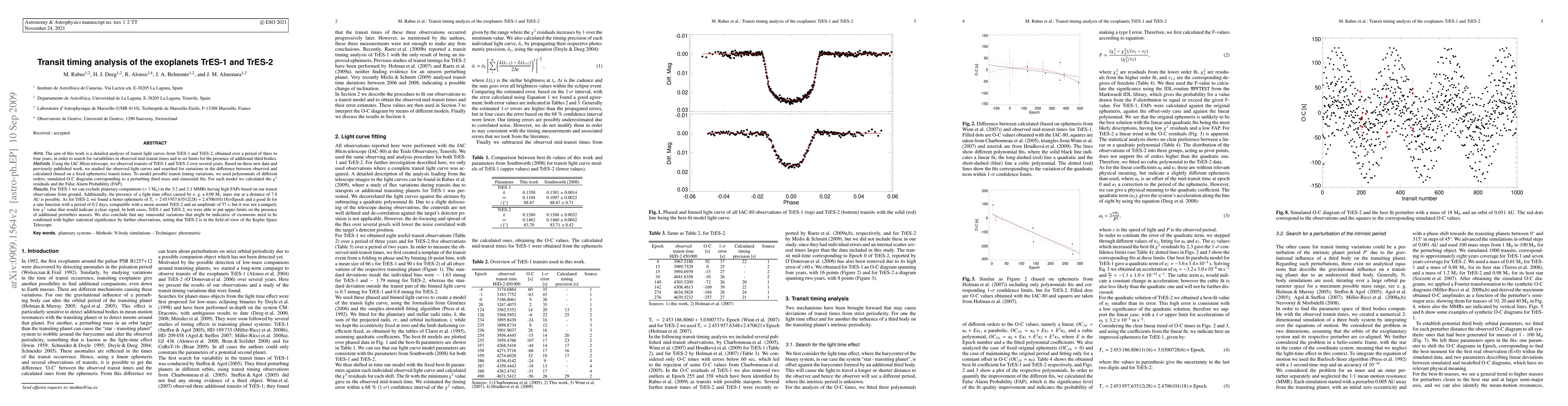 This study analyzes transit light curves of exoplanets TrES-1 and TrES-2 to search for transit timing variations and potential additional planetary companions. Results suggest no significant evidence of perturbers for TrES-1, while TrES-2 shows possible sinusoidal variations hinting at a moon, though further observations are needed for confirmation.