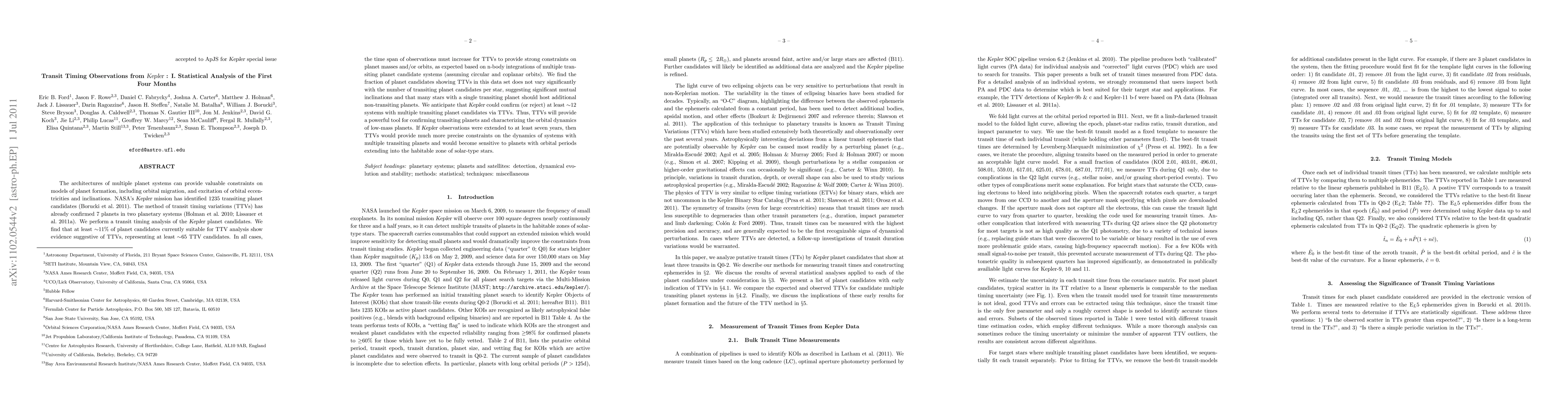 This study analyzes transit timing variations (TTVs) in Kepler's first four months of observations, finding that ~12% of planet candidates show evidence of TTVs, suggesting at least 65 TTV candidates. Extended observations are needed to confirm planet masses and orbits, but current data indicate significant mutual inclinations and potential for additional non-transiting planets.