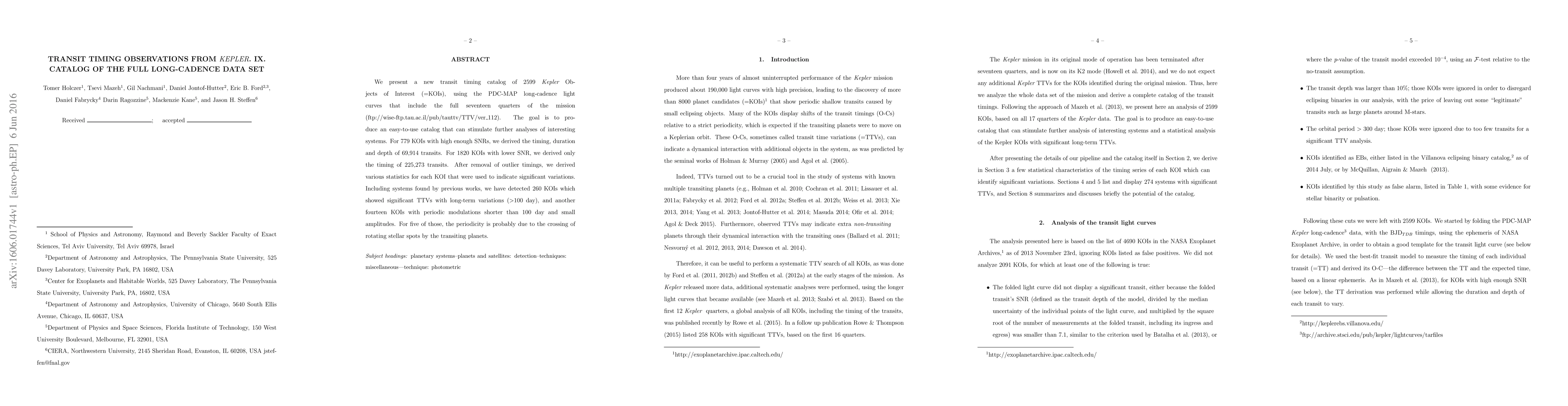 This paper presents a comprehensive catalog of transit timing observations from Kepler's long-cadence data, detailing 2599 Kepler Objects of Interest (KOIs) and their transits. It identifies significant transit timing variations (TTVs) in 260 KOIs, with additional short-term modulations in 14 KOIs, some likely due to stellar spots.