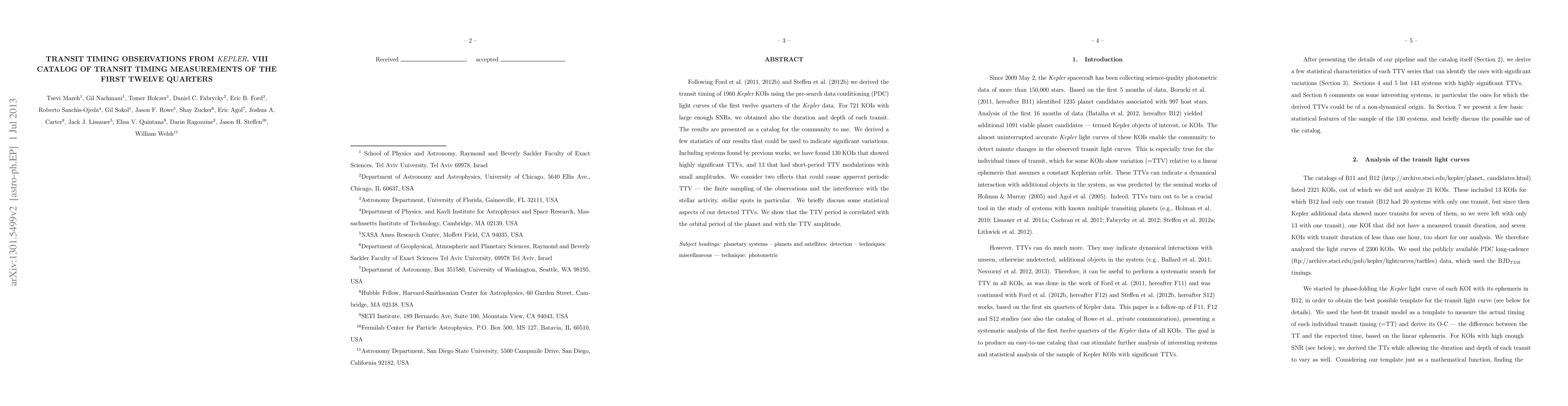 This paper catalogs transit timing measurements for 1960 Kepler Objects of Interest (KOIs) from the first twelve quarters of Kepler data, identifying 130 KOIs with significant transit timing variations (TTVs) and discussing potential causes like finite sampling and stellar activity. The findings include correlations between TTV period, orbital period, and TTV amplitude.