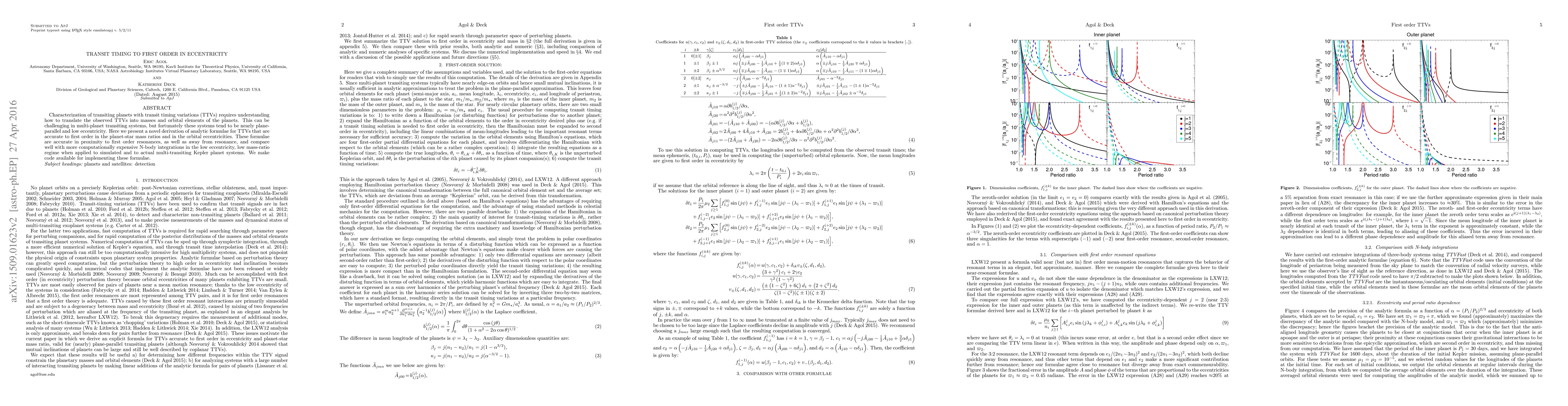 Characterization of transiting planets with transit timing variations (TTVs) requires understanding how to translate the observed TTVs into masses and orbital elements of the planets. This can be challenging in multi-planet transiting systems, but fortunately these systems tend to be nearly plane-parallel and low eccentricity. Here we present a novel derivation of analytic formulae for TTVs that are accurate to first order in the planet-star mass ratios and in the orbital eccentricities. These formulae are accurate in proximity to first order resonances, as well as away from resonance, and compare well with more computationally expensive N-body integrations in the low eccentricity, low mass-ratio regime when applied to simulated and to actual multi-transiting Kepler planet systems. We make code available for implementing these formulae.