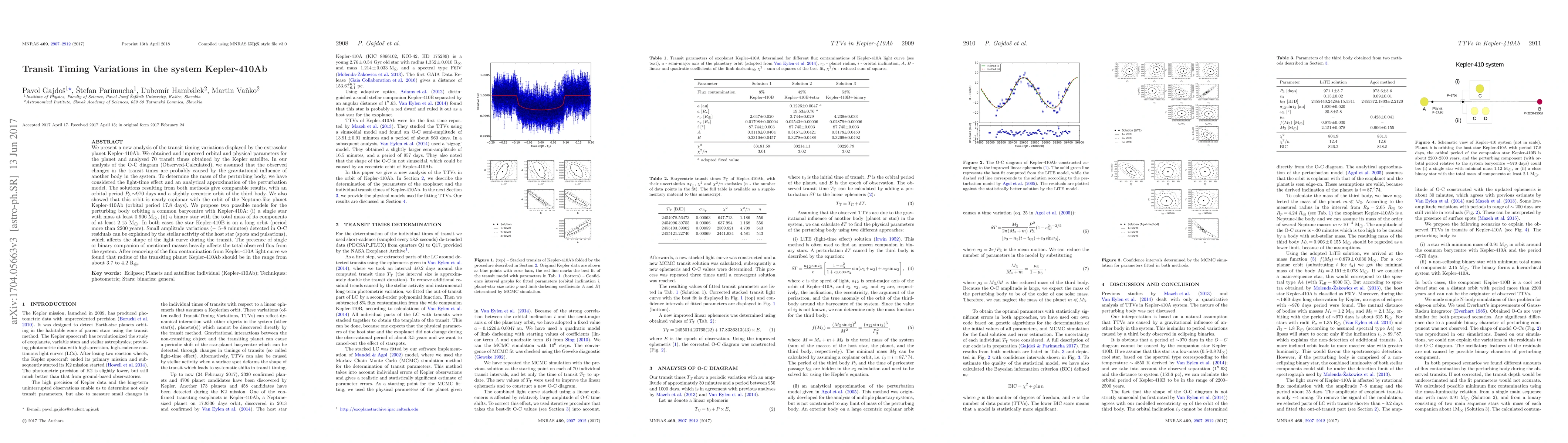This paper analyzes transit timing variations in the Kepler-410Ab system, suggesting the presence of a perturbing body causing these variations. The study proposes two models for the perturbing body: a single star or a binary star system, both with significant masses and long orbital periods, affecting the observed flux and transit timing of Kepler-410Ab.