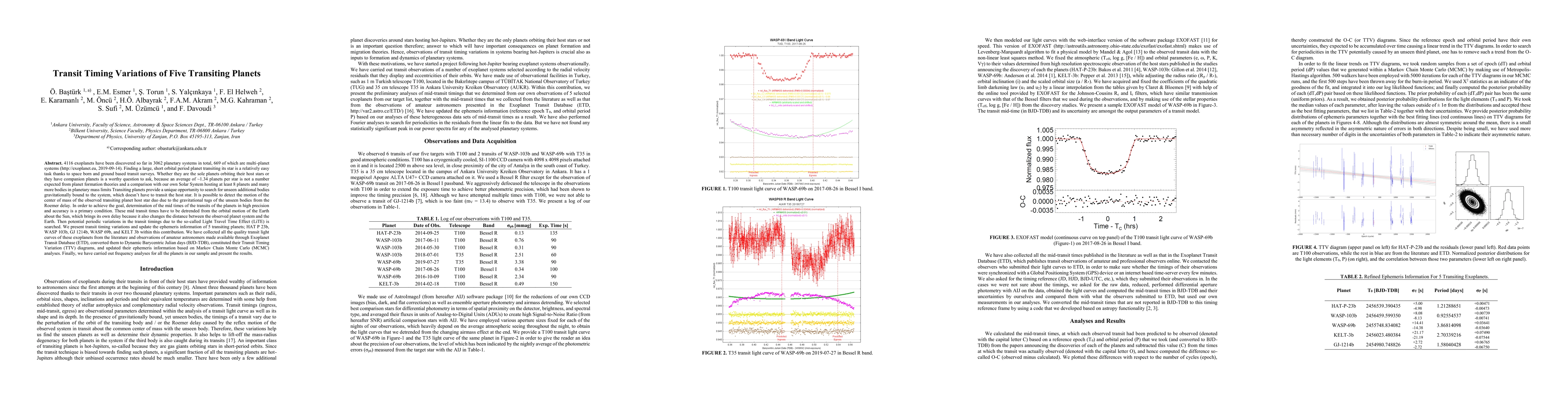 This paper investigates transit timing variations of five transiting planets—HAT-P-23b, WASP-103b, GJ-1214b, WASP-69b, and KELT-3b—to search for additional gravitationally bound bodies. It updates the ephemerides using high-precision transit timing data from both amateur and professional observers.