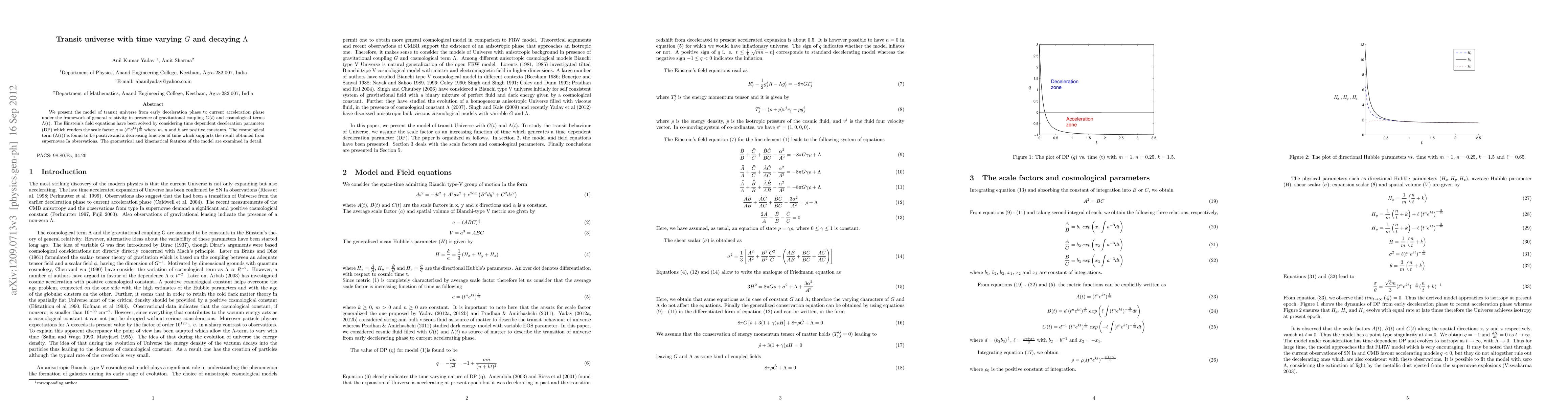 This paper explores a transit universe model transitioning from deceleration to acceleration, incorporating time-varying gravitational constant $G(t)$ and decaying cosmological term $\Lambda(t)$. The model's solution to Einstein's field equations reveals a scale factor dependent on time, supporting observations of decelerating expansion followed by current acceleration.