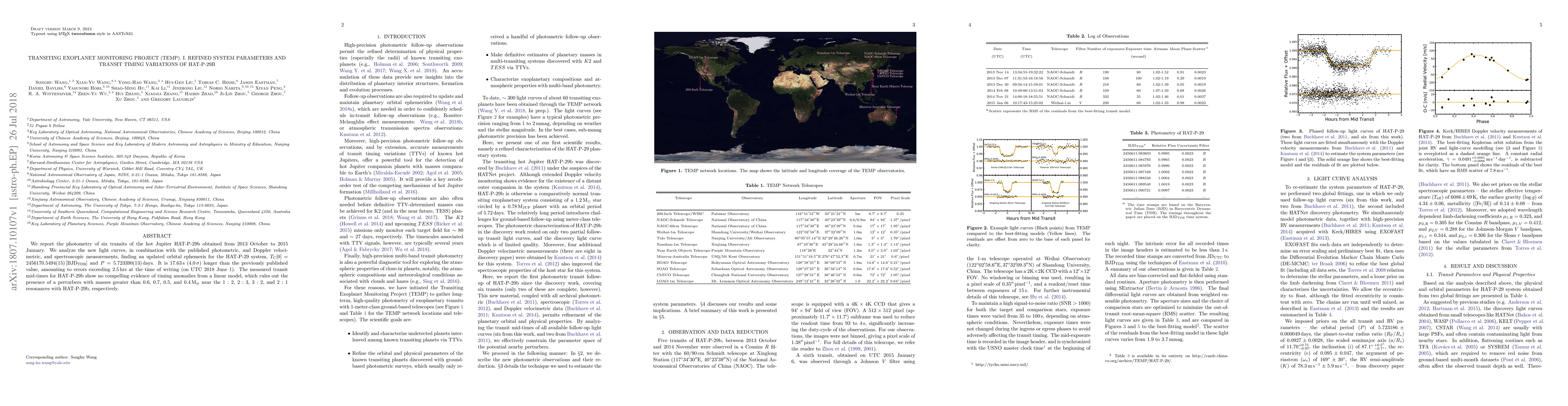 The Transiting Exoplanet Monitoring Project (TEMP) reports refined parameters for the hot Jupiter HAT-P-29b, revealing an updated orbital period of 5.723390 days, which is 17.63 seconds longer than previous values. No significant transit timing variations suggest no perturbers with masses greater than 0.4 Earth masses near specific resonances.