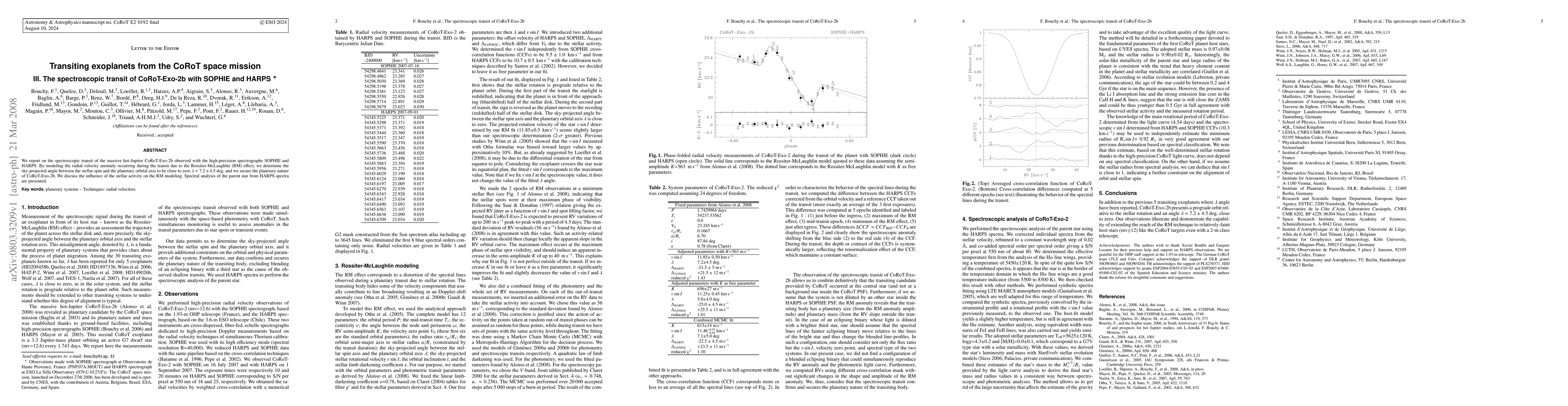 This paper reports on the spectroscopic transit of the hot-Jupiter exoplanet CoRoT-Exo-2b, using SOPHIE and HARPS spectrographs. The analysis reveals a small sky-projected angle between the star's spin and the planetary orbit, confirming CoRoT-Exo-2b's planetary nature.