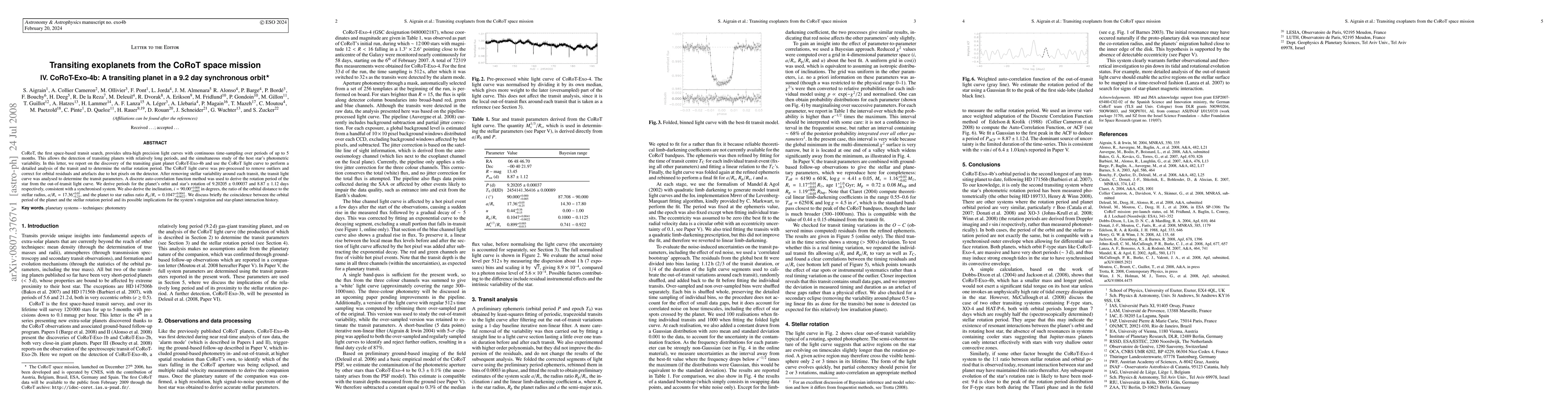 The CoRoT space mission discovered the transiting exoplanet CoRoT-Exo-4b, which orbits its host star in a 9.2-day synchronous orbit. Detailed analysis of CoRoT light curves reveals the planet's orbital period, stellar rotation period, and the planet's size relative to the star, indicating a synchronised system.
