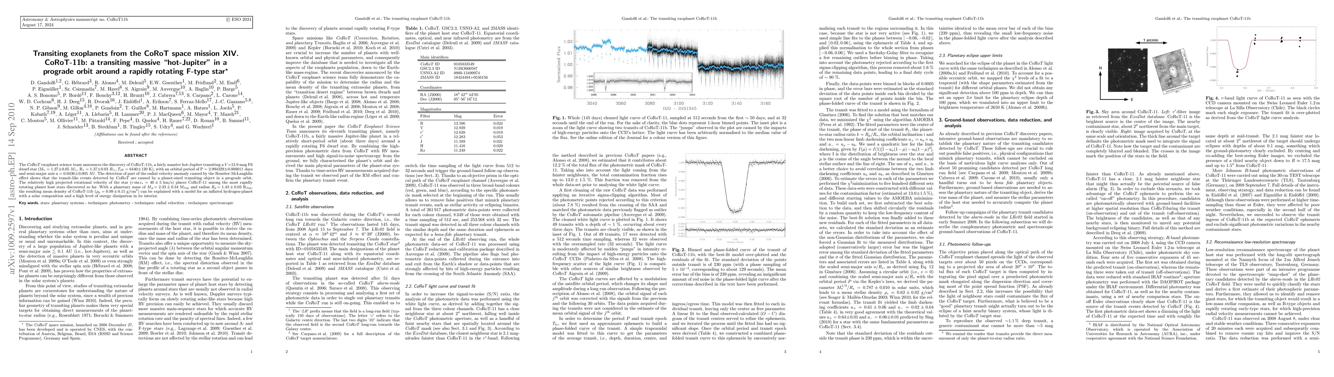 CoRoT-11b is a massive hot-Jupiter transiting a rapidly rotating F-type star, discovered by the CoRoT mission, with a prograde orbit and high mean density indicative of an inflated hydrogen composition. The star's rapid rotation and the planet's characteristics suggest significant energy dissipation within the planet.