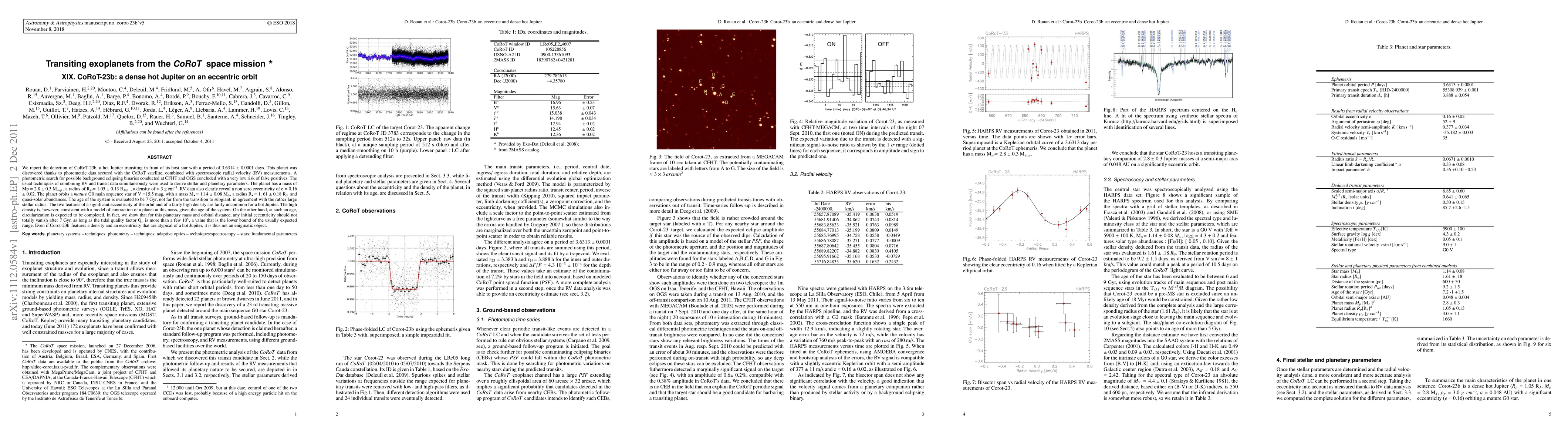 CoRoT-23b is a dense, eccentric hot Jupiter discovered via CoRoT satellite photometry and RV measurements, with a mass of 2.8 MJup and a radius of 1.05 RJup. Its orbit exhibits an eccentricity of 0.16, uncommon for such planets, but consistent with its age and expected tidal evolution.