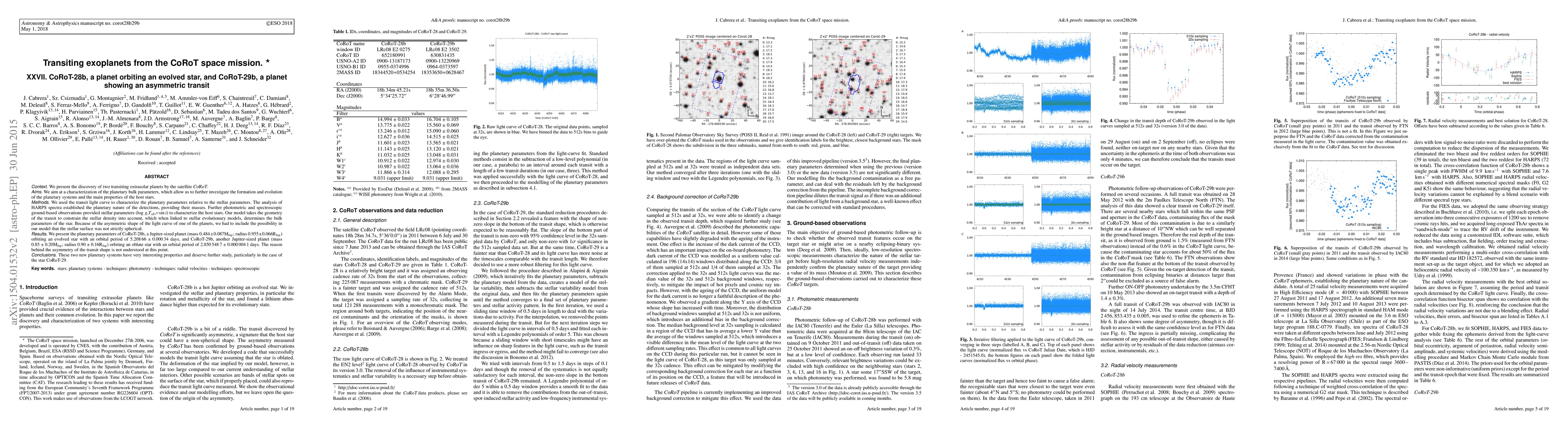 Context. We present the discovery of two transiting extrasolar planets by the satellite CoRoT. Aims. We aim at a characterization of the planetary bulk parameters, which allow us to further investigate the formation and evolution of the planetary systems and the main properties of the host stars. Methods. We used the transit light curve to characterize the planetary parameters relative to the stellar parameters. The analysis of HARPS spectra established the planetary nature of the detections, providing their masses. Further photometric and spectroscopic ground-based observations provided stellar parameters (log g,Teff,v sin i) to characterize the host stars. Our model takes the geometry of the transit to constrain the stellar density into account, which when linked to stellar evolutionary models, determines the bulk parameters of the star. Because of the asymmetric shape of the light curve of one of the planets, we had to include the possibility in our model that the stellar surface was not strictly spherical. Results. We present the planetary parameters of CoRoT-28b, a Jupiter-sized planet (mass 0.484+/-0.087MJup; radius 0.955+/-0.066RJup) orbiting an evolved star with an orbital period of 5.208 51 +/- 0.000 38 days, and CoRoT-29b, another Jupiter-sized planet (mass 0.85 +/- 0.20MJup; radius 0.90 +/- 0.16RJup) orbiting an oblate star with an orbital period of 2.850 570 +/- 0.000 006 days. The reason behind the asymmetry of the transit shape is not understood at this point. Conclusions. These two new planetary systems have very interesting properties and deserve further study, particularly in the case of the star CoRoT-29.