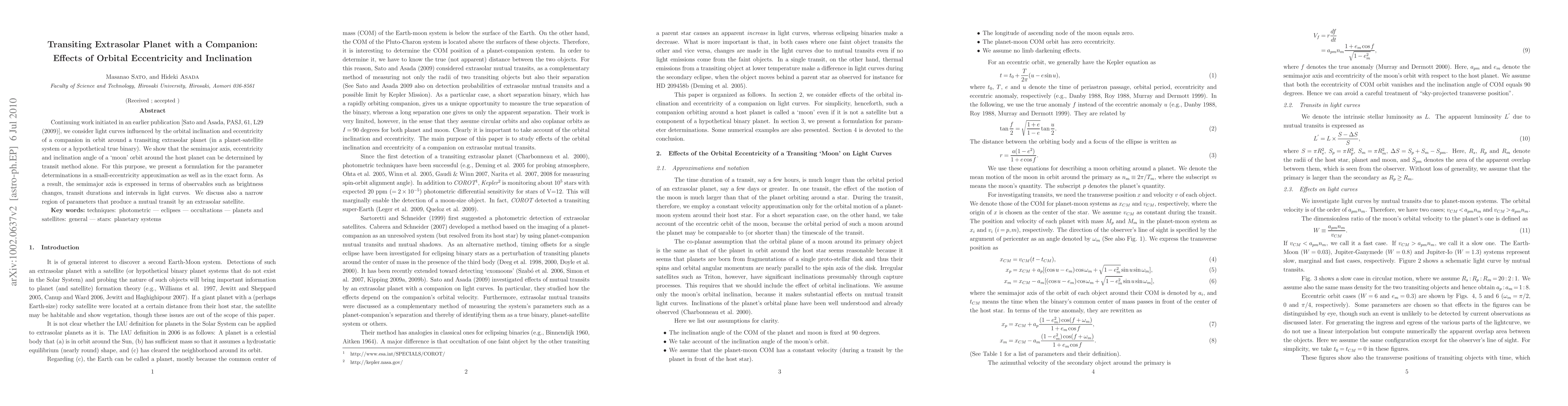 This paper extends previous research to analyze light curves affected by the orbital inclination and eccentricity of a companion around a transiting extrasolar planet. It provides formulations for determining the semimajor axis, eccentricity, and inclination of a moon's orbit using transit method alone, and discusses conditions for mutual transits by a satellite.