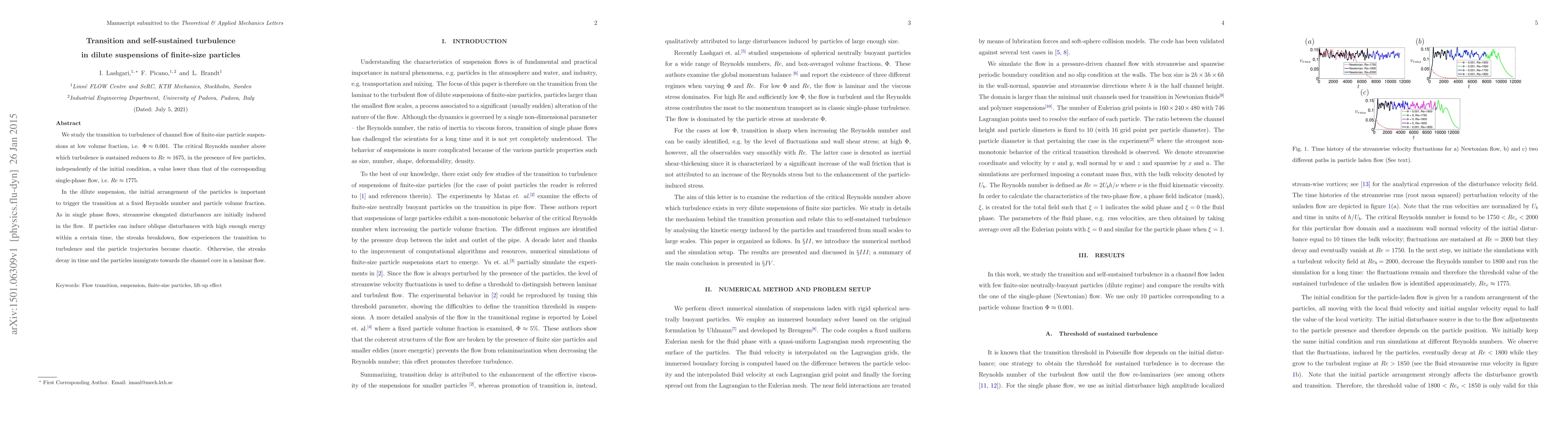 This paper investigates the transition to turbulence in low-volume fraction suspensions of finite-size particles, finding a reduced critical Reynolds number of $Re \approx 1675$ compared to single-phase flows. The initial particle arrangement significantly influences the transition dynamics, with high-energy oblique disturbances from particles inducing turbulence.