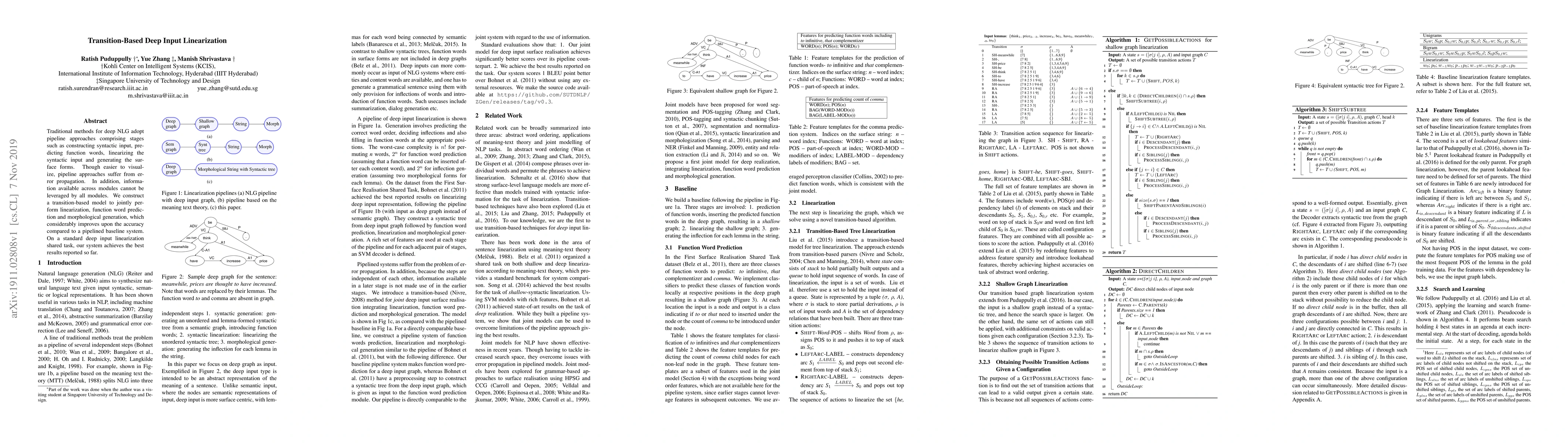 This paper proposes a transition-based deep model for natural language generation that jointly performs linearization, function word prediction, and morphological generation, achieving superior accuracy over traditional pipeline approaches by avoiding error propagation and better leveraging information across modules. The model achieves the best results on a standard deep input linearization task.