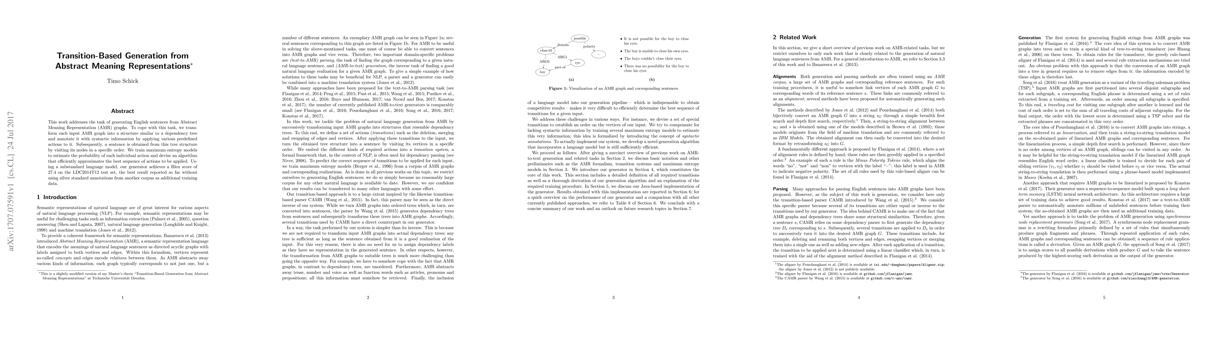 This paper presents a transition-based method for generating English sentences from Abstract Meaning Representation (AMR) graphs, employing maximum entropy models to determine the optimal sequence of predefined syntactic actions. The proposed approach achieves a BLEU score of 27.4 on the LDC2014T12 test set, outperforming other methods without using additional silver standard annotations.