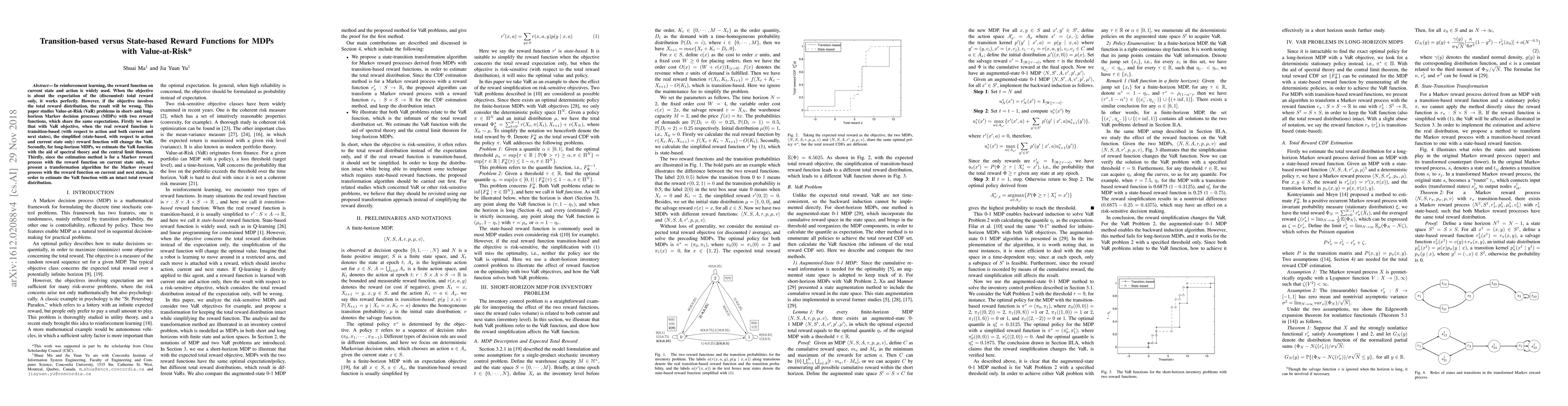 In reinforcement learning, the reward function on current state and action is widely used. When the objective is about the expectation of the (discounted) total reward only, it works perfectly. However, if the objective involves the total reward distribution, the result will be wrong. This paper studies Value-at-Risk (VaR) problems in short- and long-horizon Markov decision processes (MDPs) with two reward functions, which share the same expectations. Firstly we show that with VaR objective, when the real reward function is transition-based (with respect to action and both current and next states), the simplified (state-based, with respect to action and current state only) reward function will change the VaR. Secondly, for long-horizon MDPs, we estimate the VaR function with the aid of spectral theory and the central limit theorem. Thirdly, since the estimation method is for a Markov reward process with the reward function on current state only, we present a transformation algorithm for the Markov reward process with the reward function on current and next states, in order to estimate the VaR function with an intact total reward distribution.