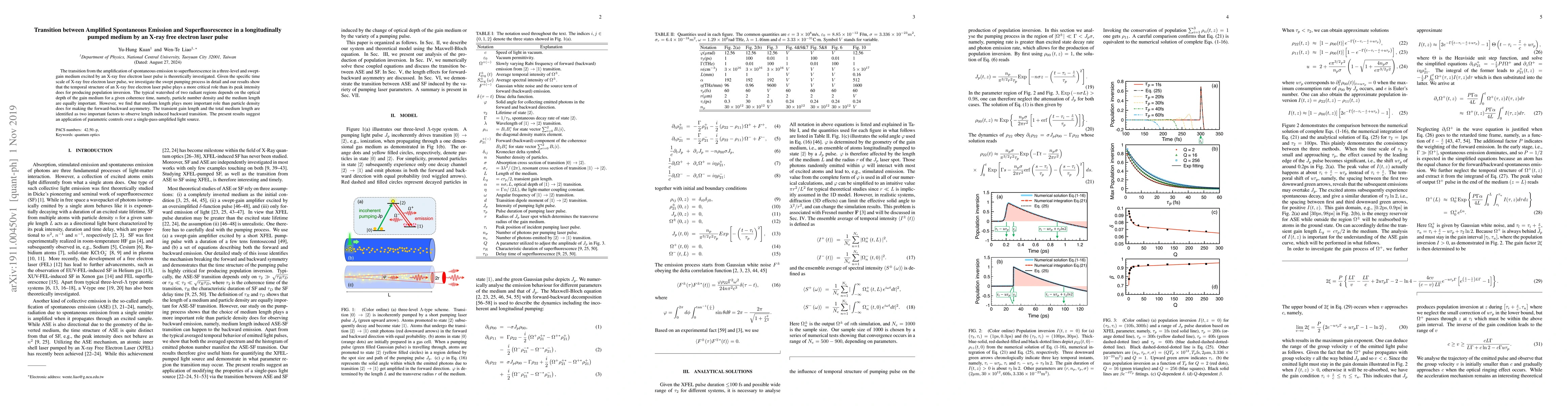 This paper investigates the transition from amplified spontaneous emission to superfluorescence in a three-level medium excited by an X-ray free electron laser pulse, emphasizing the critical role of the temporal structure of the laser pulse over its peak intensity in producing population inversion. The study highlights the importance of medium length relative to particle density in inducing forward-backward asymmetry and identifies transient gain length as a key factor for observing length-induced backward transitions.