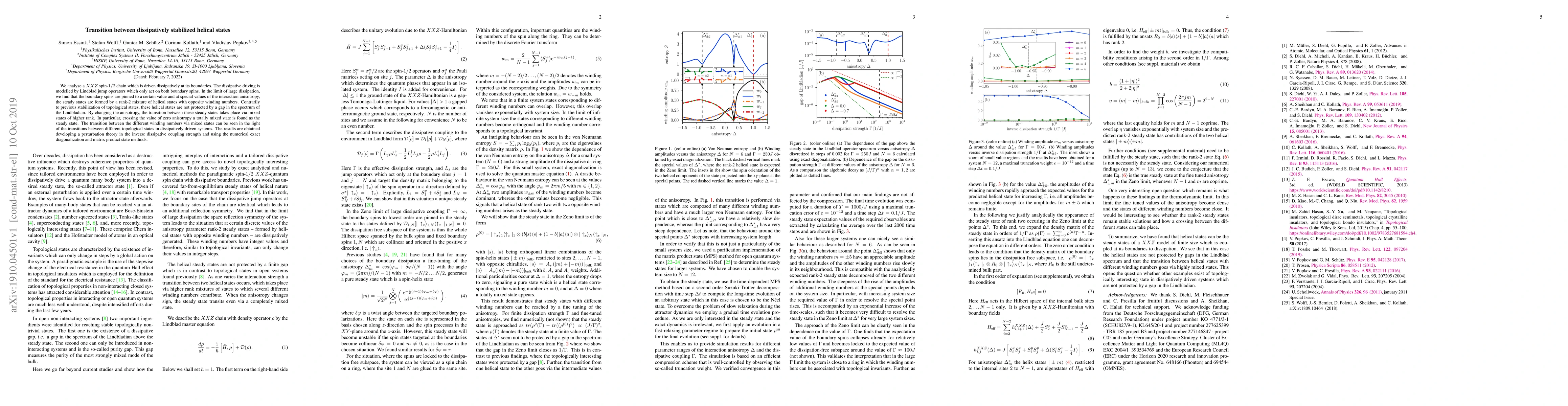 We analyze a $XXZ$ spin-1/2 chain which is driven dissipatively at its boundaries. The dissipative driving is modelled by Lindblad jump operators which only act on both boundary spins. In the limit of large dissipation, we find that the boundary spins are pinned to a certain value and at special values of the interaction anisotropy, the steady states are formed by a rank-2 mixture of helical states with opposite winding numbers. Contrarily to previous stabilization of topological states, these helical states are not protected by a gap in the spectrum of the Lindbladian. By changing the anisotropy, the transition between these steady states takes place via mixed states of higher rank. In particular, crossing the value of zero anisotropy a totally mixed state is found as the steady state. The transition between the different winding numbers via mixed states can be seen in the light of the transitions between different topological states in dissipatively driven systems. The results are obtained developing a perturbation theory in the inverse dissipative coupling strength and using the numerical exact diagonalization and matrix product state methods.