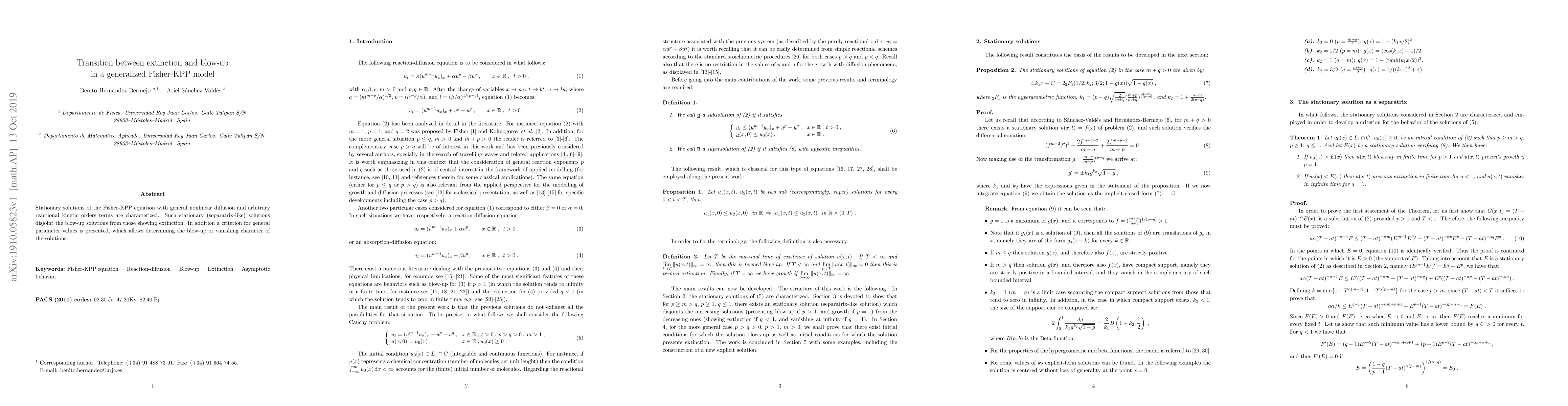 This paper characterizes stationary solutions of the generalized Fisher-KPP equation, identifying separatrix-like solutions that distinguish between blow-up and extinction outcomes. It also provides a criterion for determining whether solutions will blow up or vanish based on parameter values.