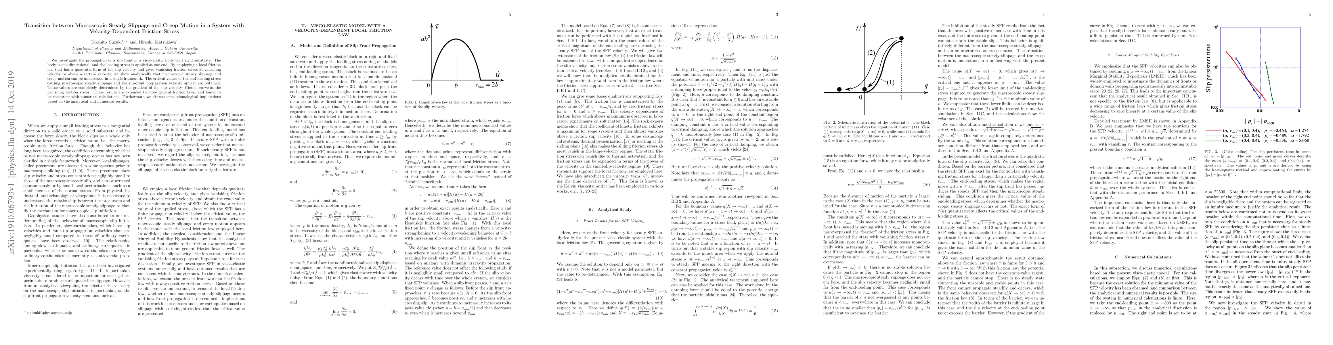 This paper analytically investigates the transition between steady slippage and creep motion in a one-dimensional visco-elastic body under velocity-dependent friction stress, showing that these behaviors can be unified within a single framework. The study determines critical stress values for these transitions and discusses their seismological implications.