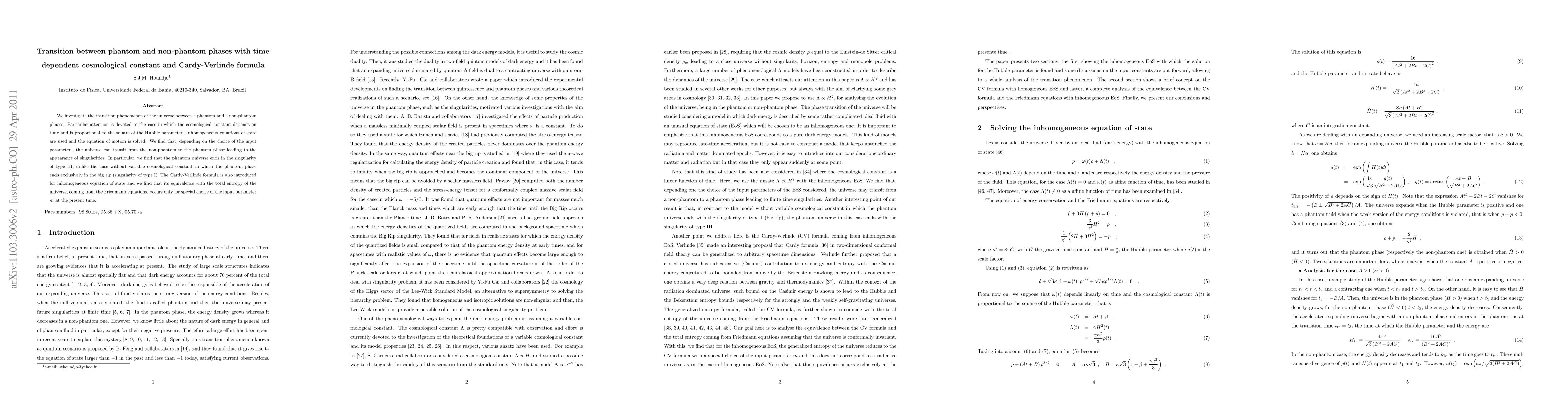 This paper explores the transition between phantom and non-phantom phases of the universe with a time-dependent cosmological constant proportional to the Hubble parameter squared. It finds that the universe can transition from a non-phantom to a phantom phase, leading to a type III singularity, unlike the type I big rip singularity without a variable cosmological constant. The Cardy-Verlinde formula is applied to inhomogeneous equations of state, revealing its equivalence with the total entropy only under specific conditions.