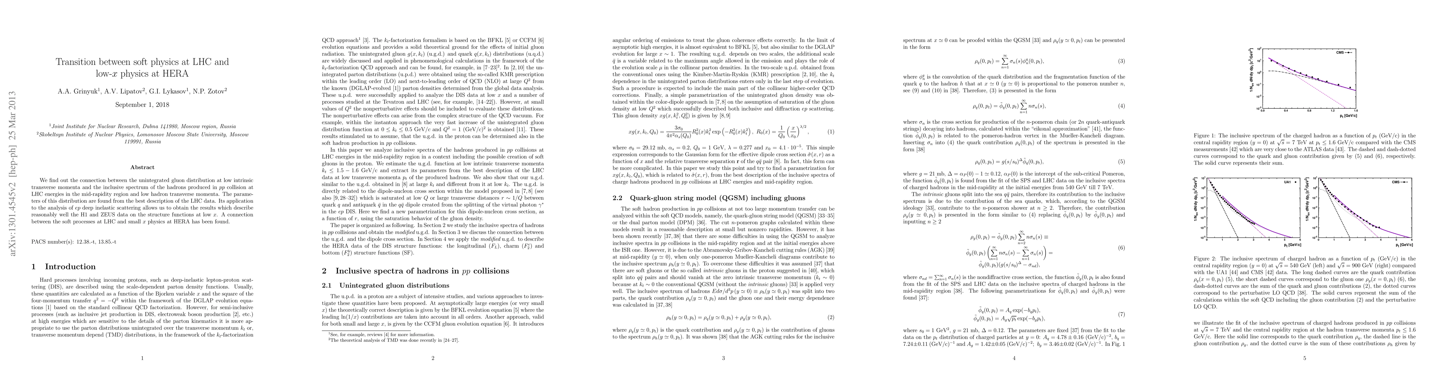 This paper establishes a link between the unintegrated gluon distribution at low transverse momenta from LHC data and the inclusive spectrum of hadrons in pp collisions, showing its applicability to interpreting HERA's low-x structure function data, thus bridging soft physics at LHC and low-x physics at HERA.